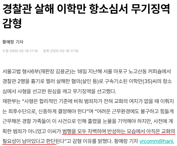 형사 두명을 살해했는데 무기징역으로 감형 ㄷㄷ