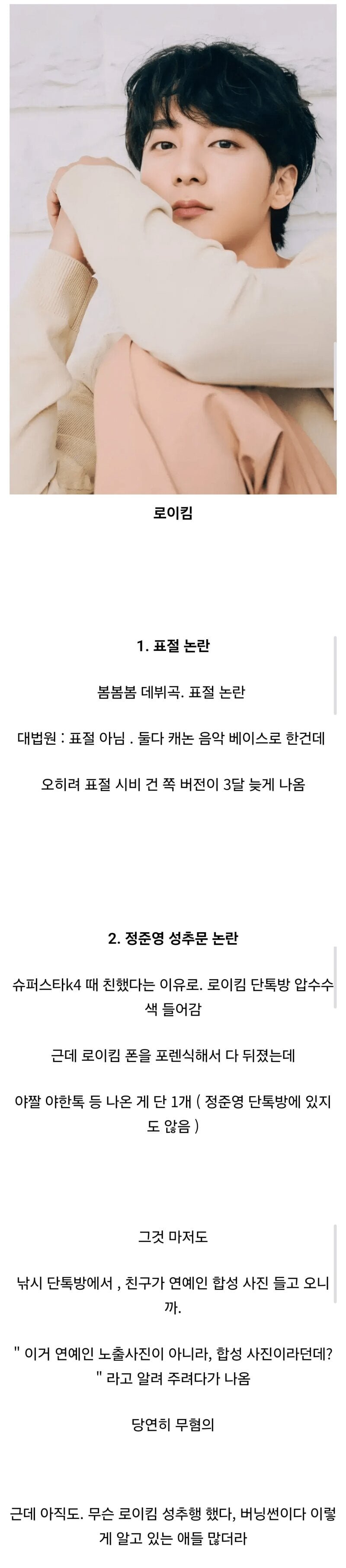 더 충격적인 것은 정준영 성추문과 관련된 이야기가 그를 괴롭히고 있다는 것이다. 슈퍼스타K4에서 친했던 인연 때문에 로이킴이 단톡방에 연루되었다는 소문이 퍼졌지만, 그의 휴대폰을 포렌식한 결과, 단 한 개의 음란한 메시지조차 발견되지 않았다! 그것도 낚시 단톡방에서 친구가 연예인의 합성 사진을 공유하자 "이건 노출사진이 아니라 합성 사진이지?"라고 알려주려다가 끼어들게 된 상황이었다.