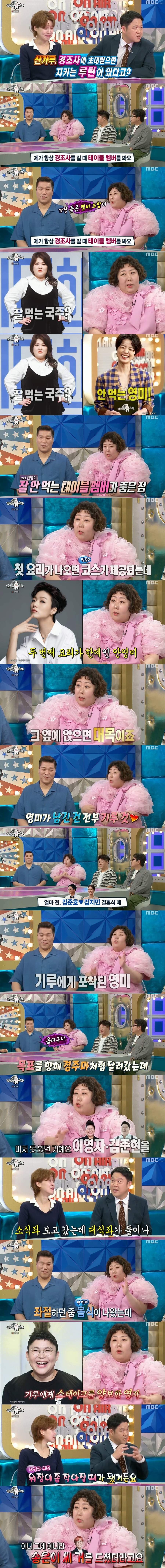 안영미가 경조사에 초대받을 때마다 반드시 옆에 앉는 신기루가 나타났다! 이번 주 라디오 스타 본방송에서 밝혀진 바에 따르면, 안영미는 경조사에서 특정 멤버 조합을 중요하게 생각한다는 것이다. 그러나 그녀가 선호하는 테이블 멤버는 언제나 ‘잘 먹는 국주’라는 놀라운 사실이 드러났다. 특히, '안 먹는 영미'와 함께 있으면 오히려 더 좋은 식사가 이루어진다고 한다.