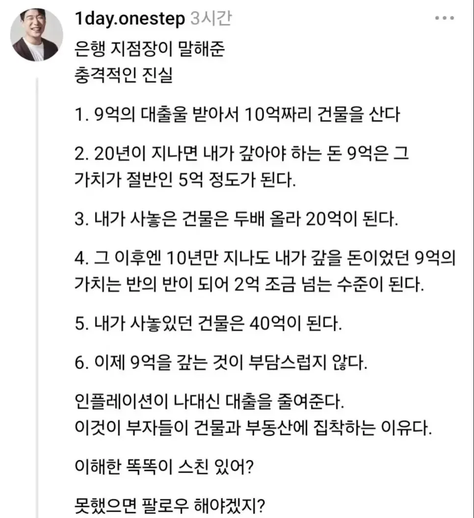 하지만 여기서 끝이 아닙니다! 10년이 더 지나면, 그가 갚아야 할 9억 원은 다시 한 번 반으로 줄어 2억 원을 겨우 넘기는 수준이 될 것이라고 합니다. 이와 반대로, 그가 소유한 건물은 무려 40억 원에 달할 것으로 예상됩니다. 이제 9억 원을 갚는 것이 부담스럽지 않다고 말하는 그! 모두 인플레이션이 그를 돕고 있다는 사실입니다.