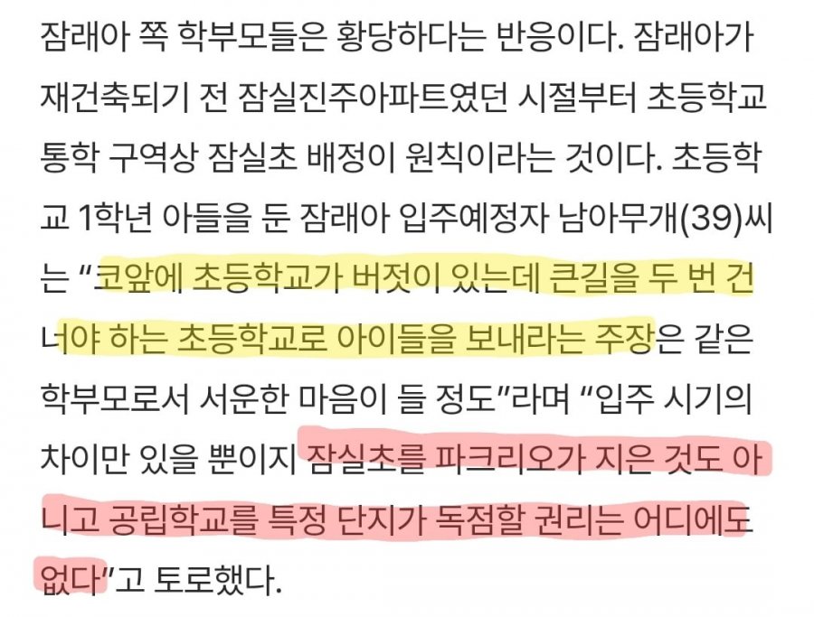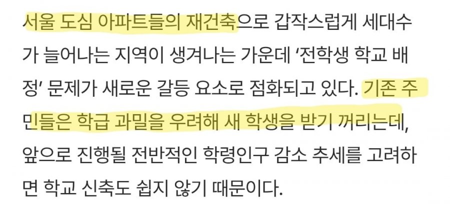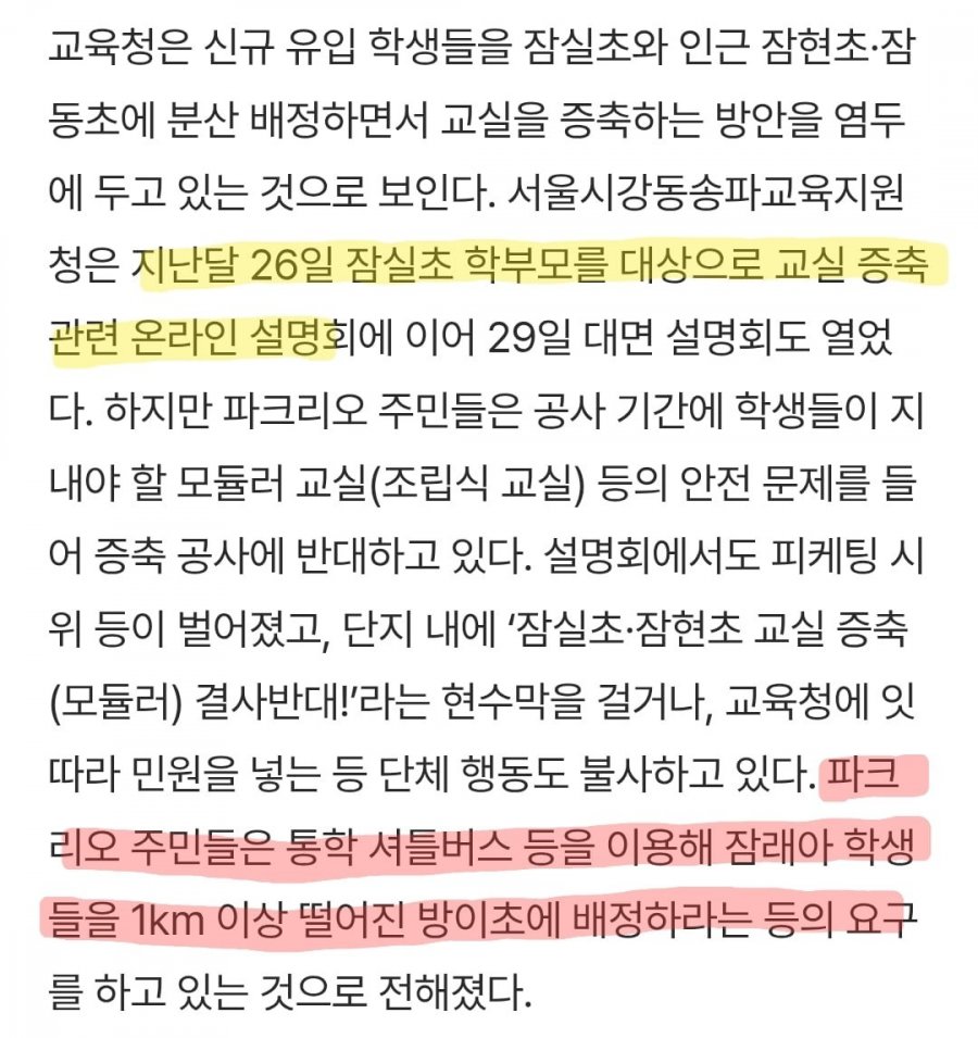 최근 재건축으로 세대 수가 급증한 지역에서는 기존 주민들이 과밀 학급을 우려해 신규 학생 수용에 반대하고 있다. 교육청은 잠실초와 인근 학교들에 학생들을 분산 배정하고 교실 증축을 고려하고 있지만, 주민들은 안전 문제를 들어 반대의 목소리를 높이고 있다.