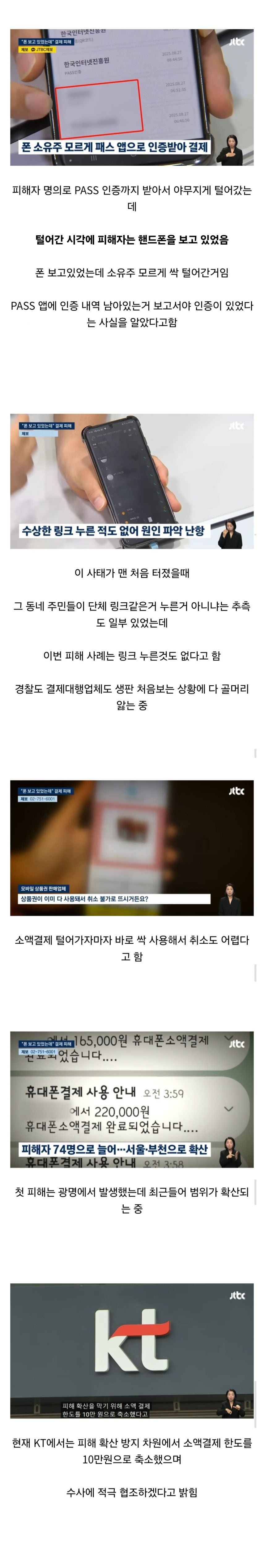 KT 사태가 점점 심각해지고 있다는 소식이 전해졌다. 한 피해자가 "폰을 보고 있었는데" 갑자기 결제 피해를 입었다고 제보했다. 이 피해자는 휴대폰 소유주임에도 불구하고, PASS 앱을 통해 자신의 명의로 인증이 이루어져 결제가 진행된 사실을 뒤늦게 알게 되었다고 전했다. 충격적인 것은, 피해자가 전혀 링크를 클릭한 적도 없었고, 지나치게 빠른 속도로 소액 결제가 진행되어 상품권이 싹 사용되고 취소조차 불가능한 상태가 되었다는 점이다.