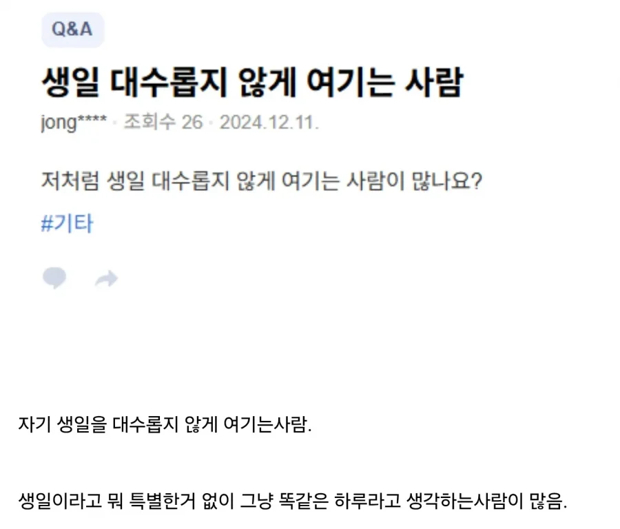 결국, 이 글은 생일을 특별한 날로 여기지 않는 수많은 사람들의 공감대를 형성하며 온라인을 뜨겁게 달구었다. 그들은 그저 하루하루를 소중히 여기며 특별한 날이나 축하 없이 살아간다고 주장한다. 이 내용을 접한 누리꾼들은 "사실 나도 거의 대부분의 생일을 잊고 살아왔다", "이제는 생일이란 단어가 그리 특별하지 않다"라며 댓글을 달았다. 과연, 생일이란 과거의 화려함을 잃고 평범한 일상으로 전락해버린 것일까? 세상은 점점 더 생일을 대수롭지 않게 여기는 유형의 사람들로 가득 차가고 있다!