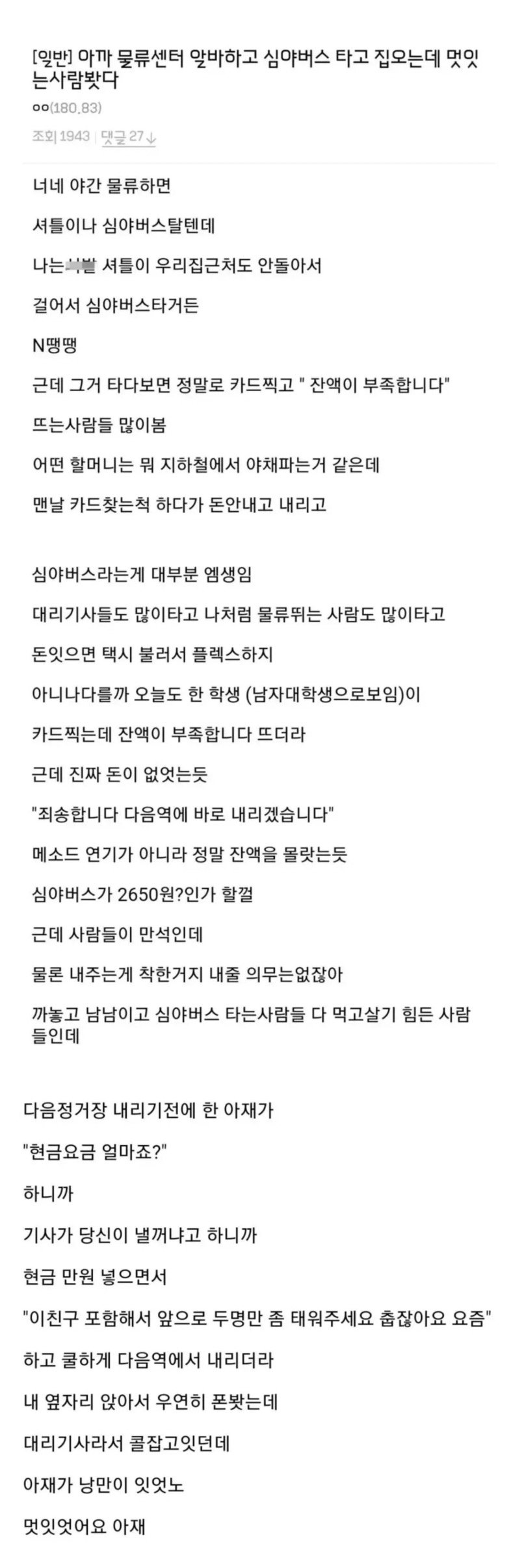 심야버스를 타고 돌아오던 한 남성이 기막힌 장면을 목격했습니다. 아르바이트를 마치고 집으로 향하는 길, 그는 불행하게도 잔액이 부족하다는 메시지를 받고 당황한 남학생을 발견했습니다. 학생은 "죄송합니다, 다음 역에서 내리겠습니다"라며 진솔하게 사정했지만, 심야버스 안의 분위기는 무언가 달랐습니다. 잔액이 부족한 사람들은 물론, 대리기사와 같은 어려운 사람들로 가득했던 그곳에서, 지나가는 차가운 바람과 함께 진한 동정심이 피어올랐습니다.