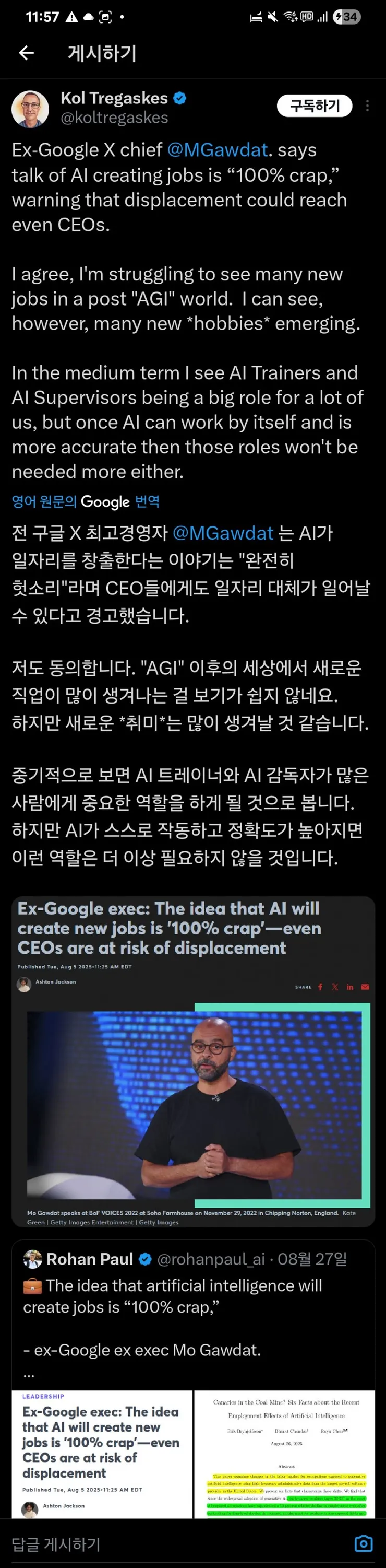 전 구글 X CEO인 @MGawdat가 충격적인 발언을 담은 인터뷰를 통해 AI가 일자리를 창출한다는 주장을 강하게 반박했습니다. 그는 AI로 인해 세상에선 그동안 존재하지 않았던 직업들이 생기는 것이 아니라 진정한 위기가 찾아오고 있다고 경고했습니다. "AI가 일자리를 만든다는 것은 100% 헛소리입니다,"라고 그는 단언하며, 심지어 CEO와 같은 고위직도 AI의 대체 가능성에서 벗어나지 못할 것이라고 말했습니다.