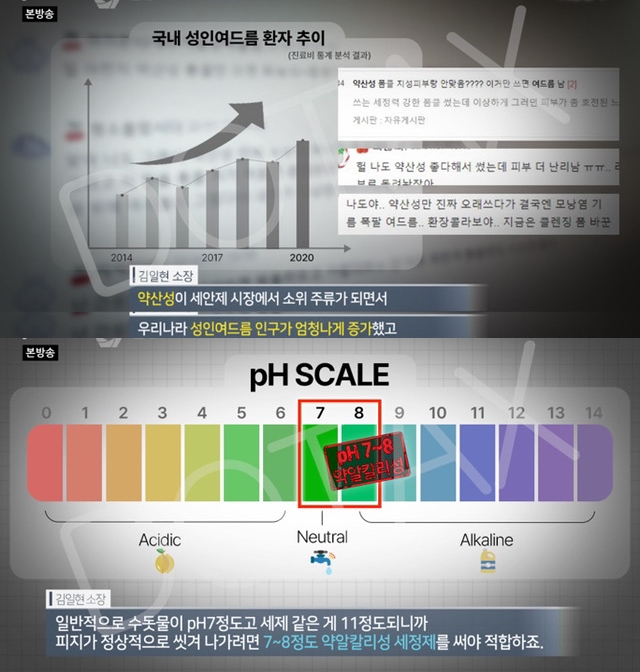 다수의 성인이 여드름으로 고생하는 원인이 바로 이 약산성 세안제라는데, 그 통계에 따르면 2014년부터 2020년 사이 성인 여드름 환자가 급증하고 있다고 한다. 심지어, 사람들은 "약산성이 좋다"는 말에 끌려 계속 쓰다가 오히려 피부 상태가 악화됐다고 토로했다. 어떤 이는 모낭염과 여드름이 한꺼번에 폭발하면서 절망적인 상황에 처하기도 했다.