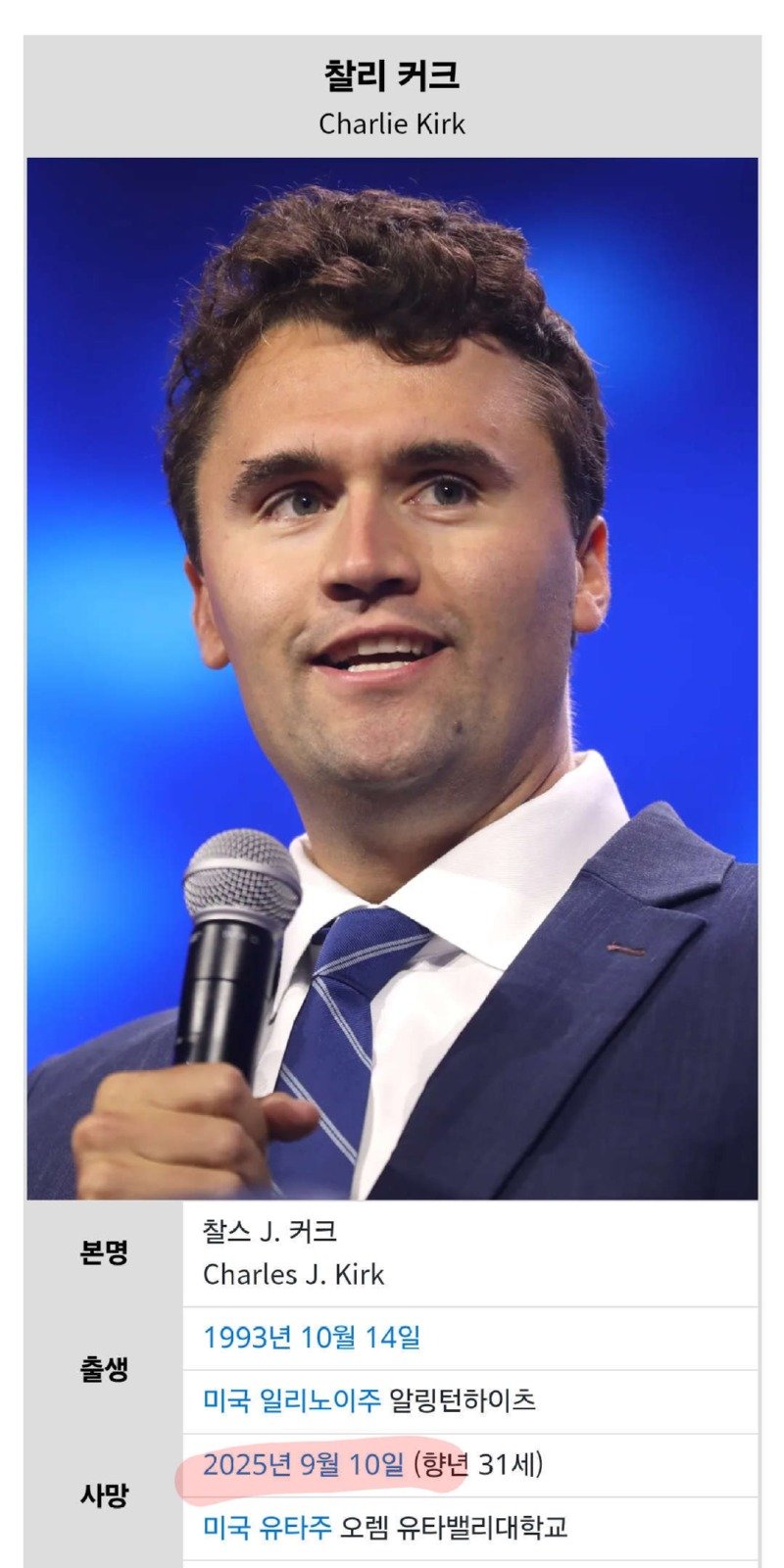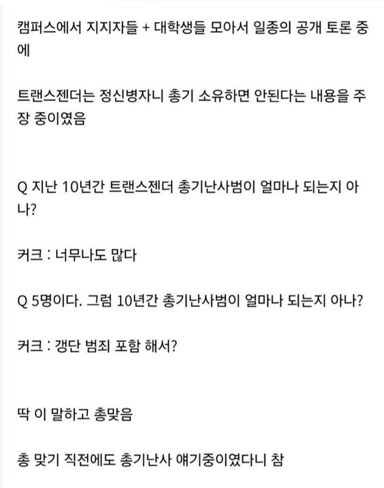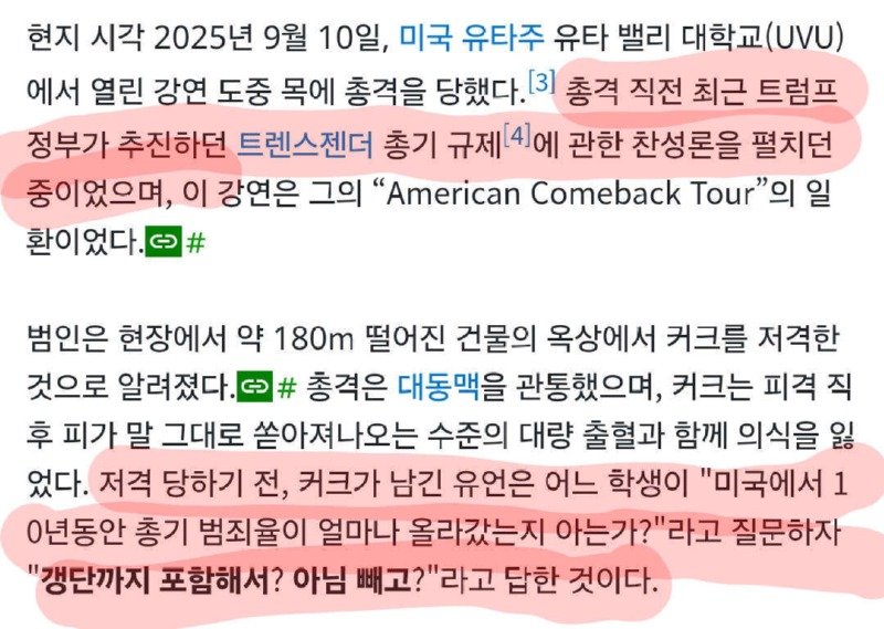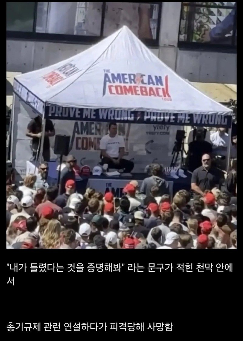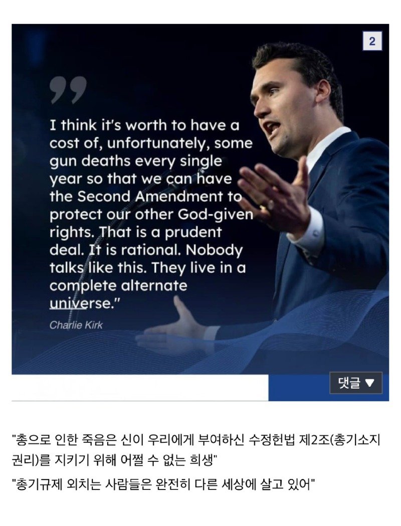 미국의 논객 찰리 커크가 2025년 9월 10일 유타주에서의 강연 중 총격을 당해 사망하는 비극적인 사건이 발생했다. 커크는 사망하기 전, 총기 규제를 반대하며 "총으로 인한 죽음은 신의 뜻으로 우리에게 주어진 수정헌법 제2조를 지키기 위한 불가피한 희생"이라는 논리를 펼쳤다. 그의 발언은 많은 이들에게 충격을 주었으며, "총기규제를 외치는 사람들은 완전히 다른 세상에 살고 있다"고 단언했다.