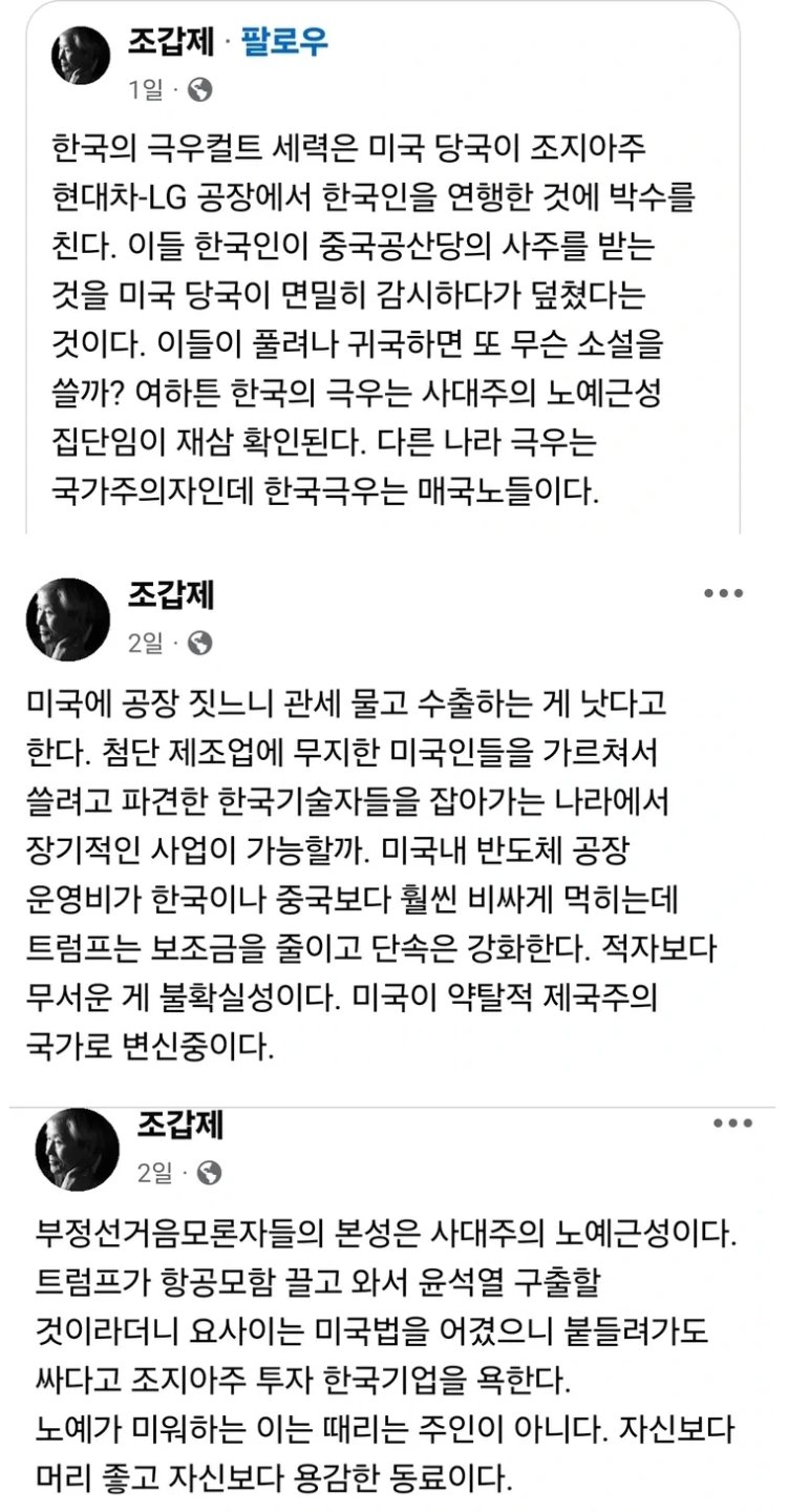 조갑제가 전하고자 하는 소식은 한국 극우의 화난 목소리를 담고 있다. 최근, 미국 당국이 조지아주 현대차-LG 공장에서 한국인을 연행한 사건이 발생하자, 극우 세력은 이를 두고 미국이 중국공산당의 영향을 받는 한국인을 단속한 것이라며 자랑스러운 태도를 보였다. 이들이 한국으로 돌아온 후 어떤 이야기가 나올지 불안감이 감돈다.