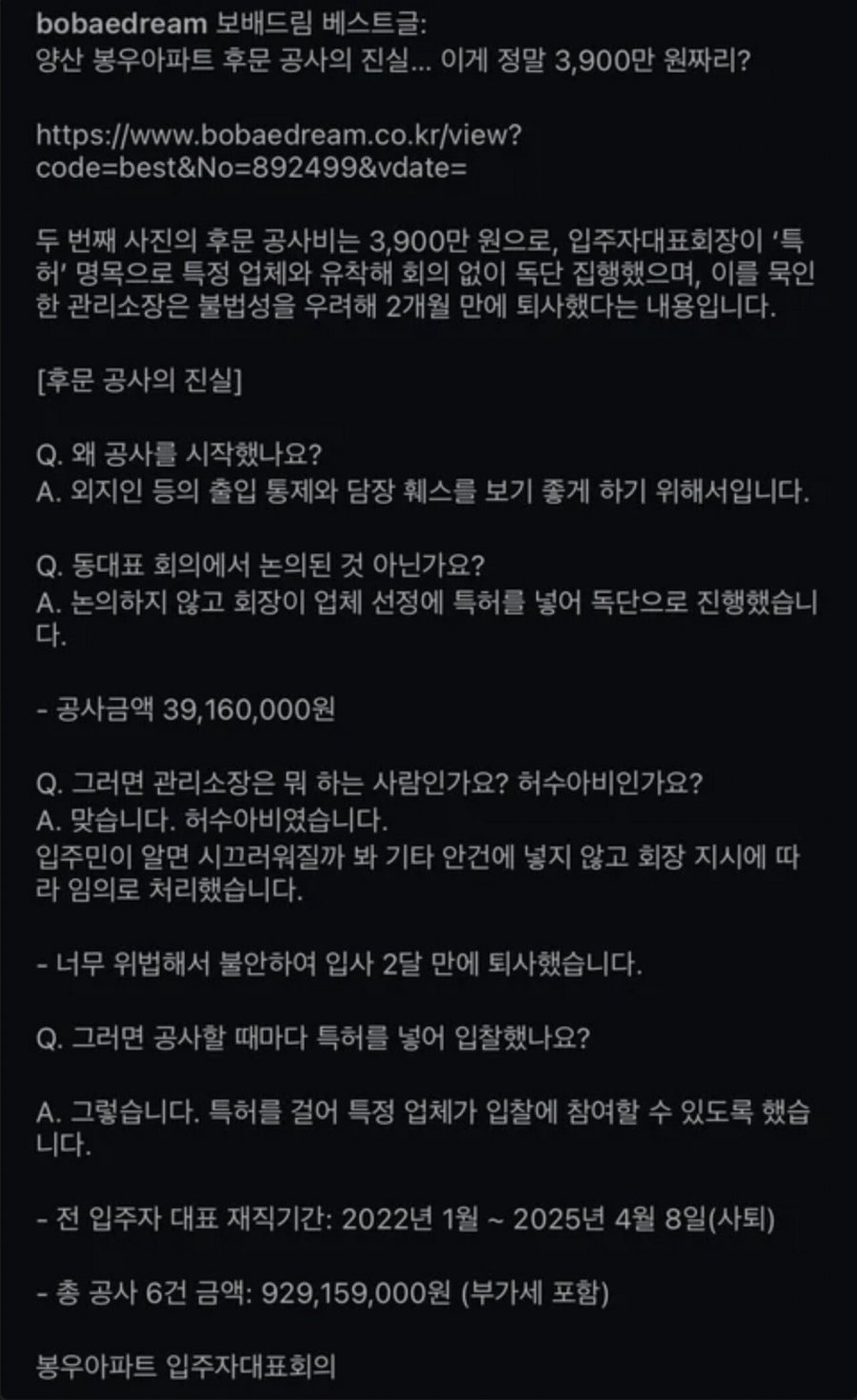 공사 선정 과정이나 입찰 공고 전 단계가 법적 요건을 충족했는지 여부는 아직 확인되지 않았다. 회장의 단독 결정이 관행처럼 굳어지려 하는지, 아니면 단순한 행정 실수인지 파악이 필요하다.