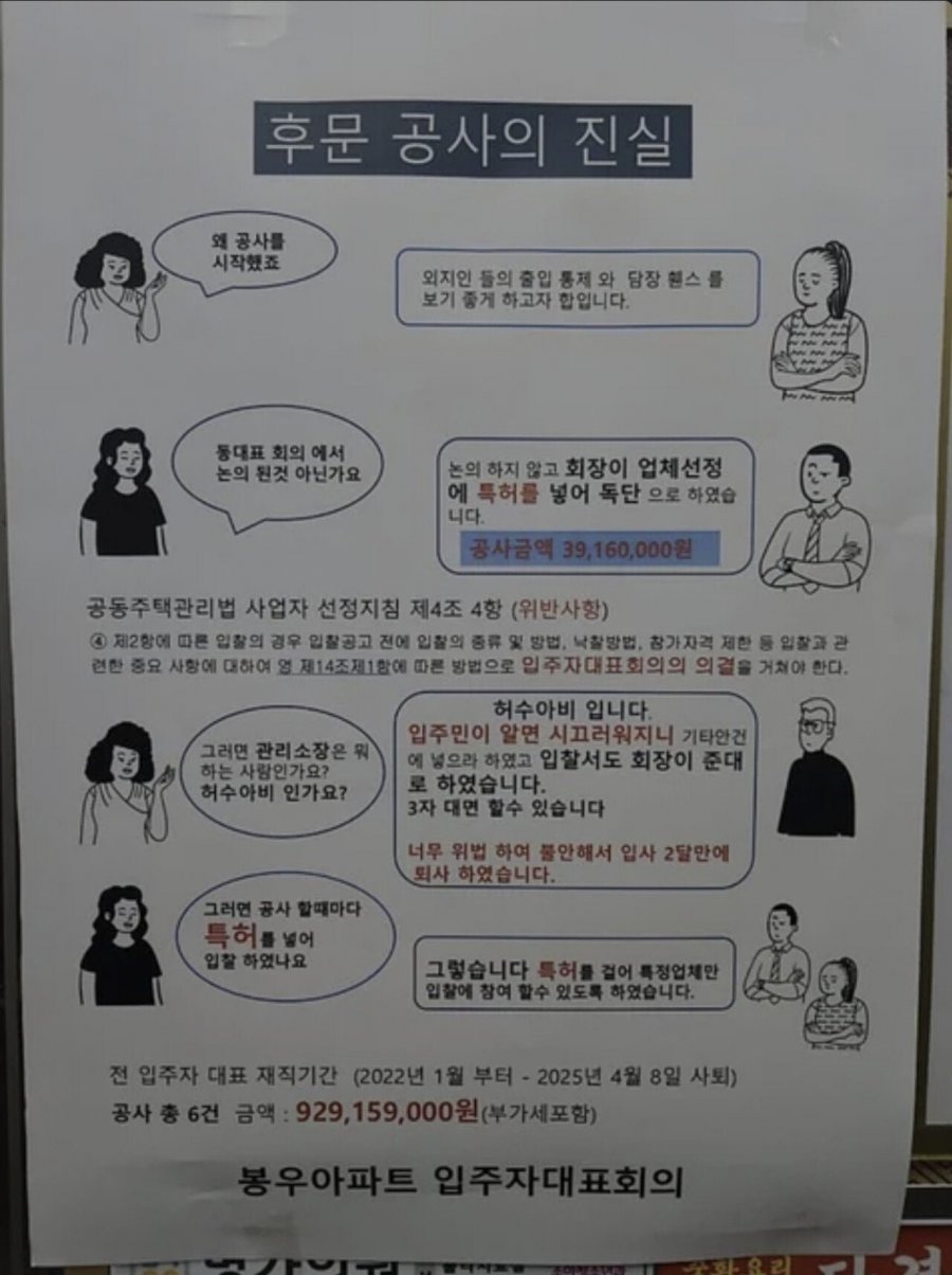공사비는 39,160,000원으로 책정됐다. 입찰과 관련한 중요한 사항은 입주자대표회의 의결을 거쳐야 한다는 법 조항이 있는데, 이 점이 지켜졌는지 의문이 남는다.