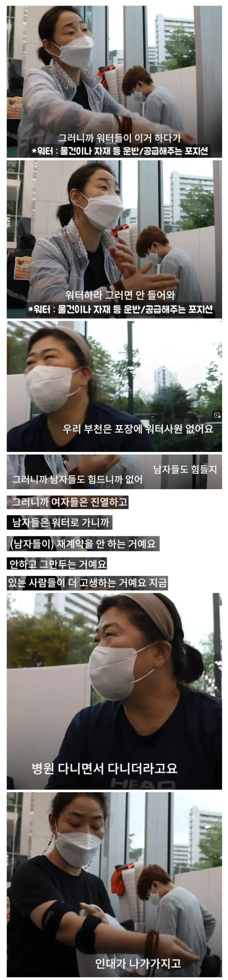 특히 워터로 불리는 물건 운반·공급 포지션의 배치가 과거 남성 중심에서 점차 다양한 성별이 참여하는 방향으로 바뀌고 있다고 한다. 부천 지역 포장 구역은 남성 인력이 줄고 여성 직원이 늘었다는 이야기가 돌며, 남성들이 일부 워터 직무로 재배치되었다는 주장도 함께 제기된다.