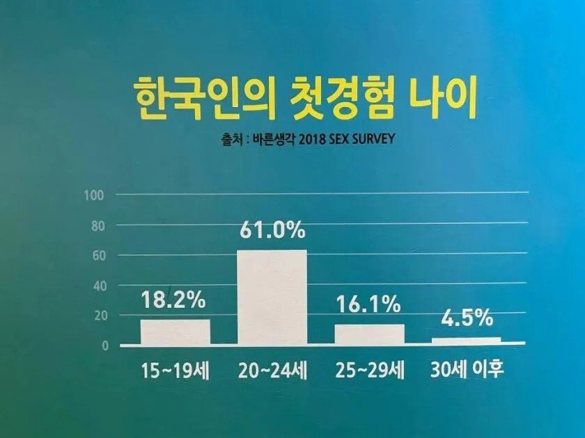 첫경험 연령 분포에 관해선 15~19세와 20~24세의 비중이 상당하다고 들려오지만, 구체 수치의 세부 해석은 상이하다. 어떤 맥락에서 이런 구성이 등장했는지 파악이 필요하다.