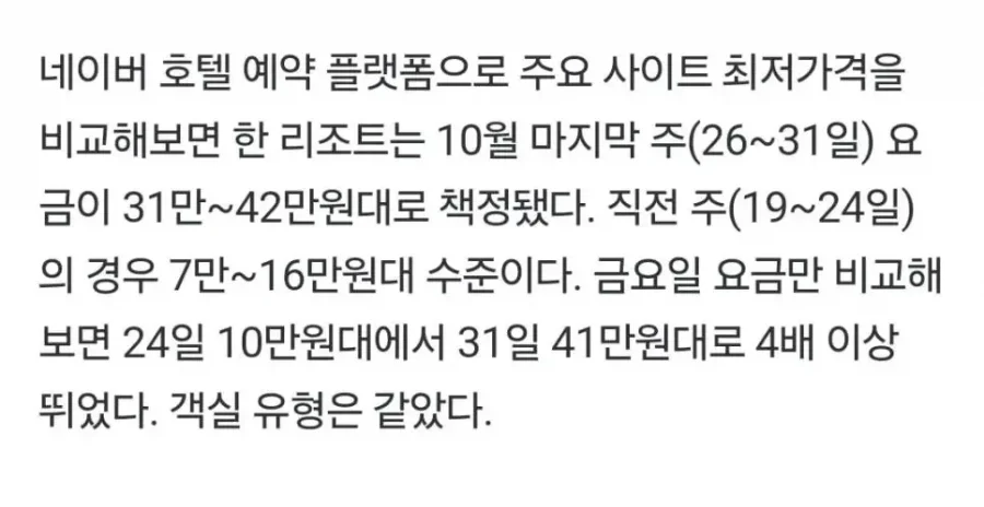 가장 직접적인 맥락은 수요의 급증이다. APEC 같은 초대형 국제행사는 방문객, 협력사, 공연·부대행사 관계자까지 몰리면서 숙박 수요를 비현실적으로 끌어올린다. 기사에 따르면 19~24일 주간에는 7만~16만원대였던 최소가가, 26~31일엔 31만~42만원대로 상향된다. 금요일 요금만 비교해도 24일의 10만원대에서 31일의 41만원대로, 같은 곳의 같은 방이 네 배 가까이 뛰는 모습이다. 이 차이는 단순한 “주말 요금이 오른다”는 수준을 넘어서, 이벤트 자체가 방 한 칸의 가치를 얼마나 끌어올리는지 보여준다.