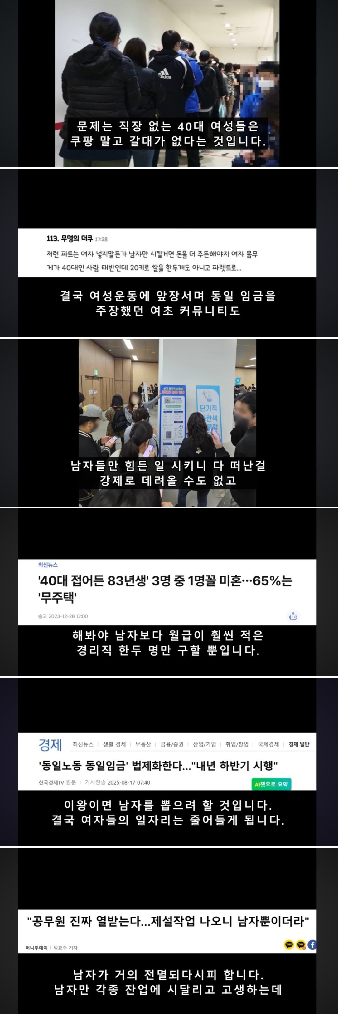 다수의 발언과 기사에서 보여주는 것은, 40대 여성의 노동시장 바닥이 만만치 않다는 현실 인식이다. 창구가 좁아지는 가운데, 물류나 단기간 계약 같은 비정규 직군에서 여전히 ‘중요하지만 어렵고 체력소모가 큰 일’을 떠안아야 한다는 불만이 교차한다.