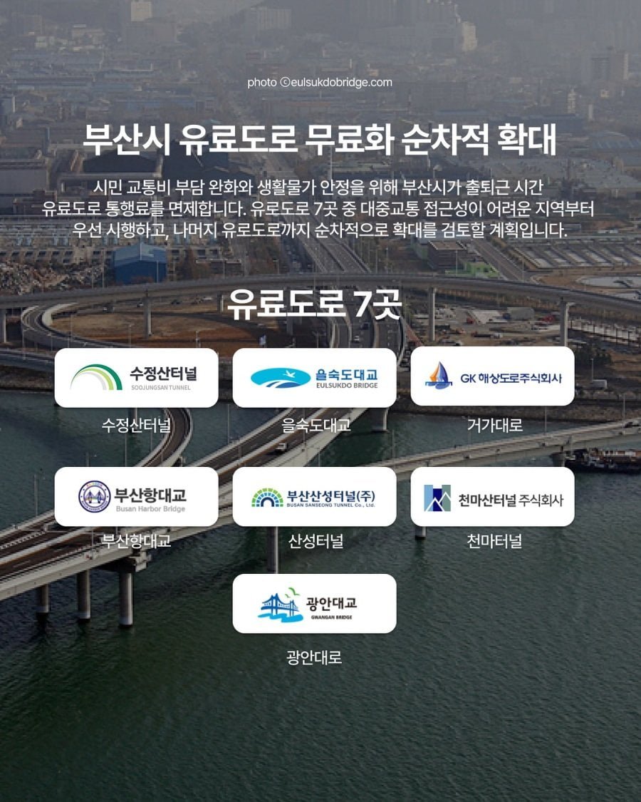부산시가 출퇴근 시간에 유료도로 통행료를 면제하는 방안을 검토 중이다. 7곳의 유료도로를 우선 면제 대상으로 삼고, 대중교통 접근성이 취약한 지역부터 시작해 순차적으로 확대하는 방향이다.