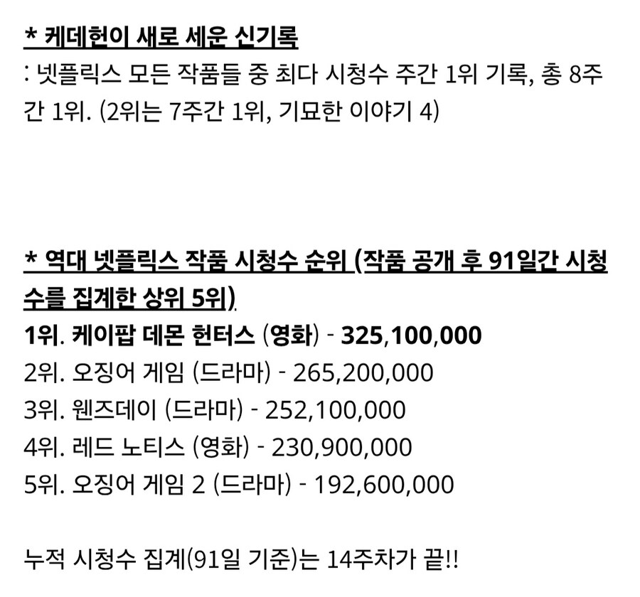또 하나 주목할 점은 시청 시간의 규모다. 이 달의 데이터를 보면 케데헌의 영상은 약 1시간 40분의 런타임임에도 불구하고, 누적 시청 시간으로 보면 수천만 시간에 달한다. 이는 단순 조회 수를 넘어, 시청자들이 콘텐츠에 오래 머물며 몰입하고 있음을 뜻한다. 플랫폼이 관찰하는 “관람 지속성”이 이슈의 중심축으로 작용하고 있음을 보여 준다.