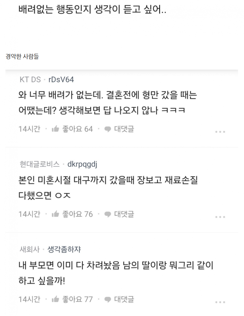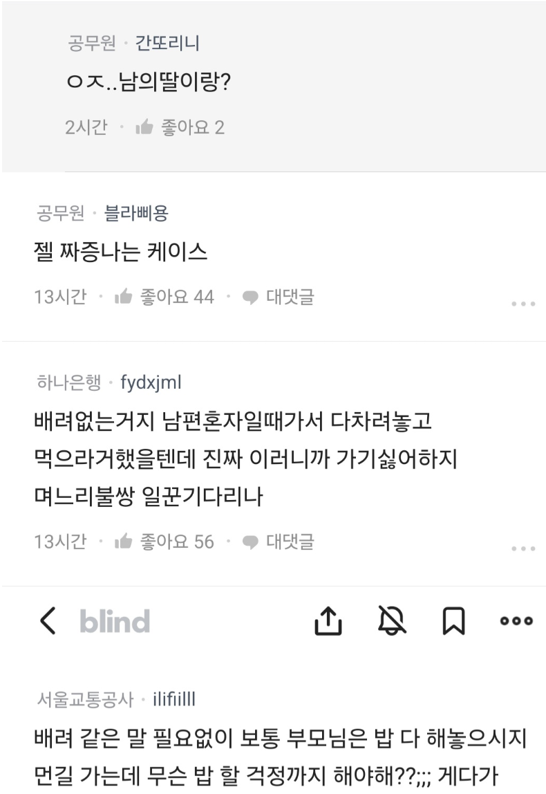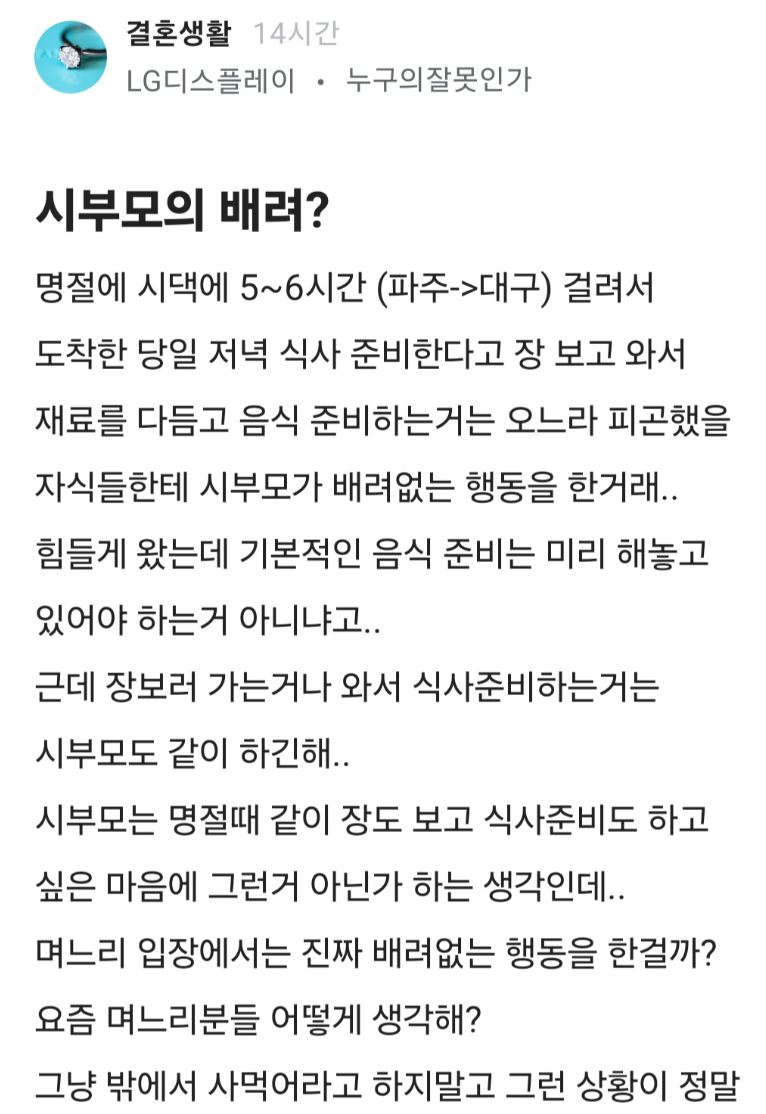 나는 이 에피소드를 보며 며느리의 입장을 먼저 떠올린다. 며느리는 장을 보고 음식을 다듬는 과정까지 포함된 노동이 체력을 더 소진시켰다고 느끼고, 시부모가 그 부담을 덜어주지 않는다고 받아들인다. 이때의 해석은 누구의 관점에 서느냐에 따라 크게 달라진다.