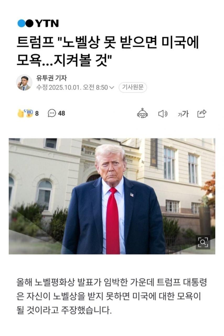 노벨평화상 발표가 임박한 가운데, 트럼프 대통령이 “노벨상을 못 받으면 미국에 모욕이다”라고 말했다. 보도에 따르면 이 발언은 개인의 자존심을 넘어, 국제 이미지의 문제로 읽힌다.