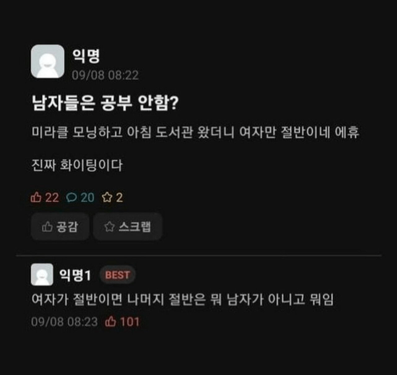 최근 온라인에 떠도는 한 글은 “남자들은 공부를 안 함?”이라는 질문으로 시작한다. 미라클 모닝과 아침 도서관 현장을 둘러싼 코멘트는 남녀 간 비교로 읽히고, “여자만 절반”이란 말이 화두가 된다. 이 글은 사실 여부를 가리려 하기보다, 사회가 남녀를 어떻게 관찰하고 해석하는지의 맥락을 들여다보려는 의도가 보인다.