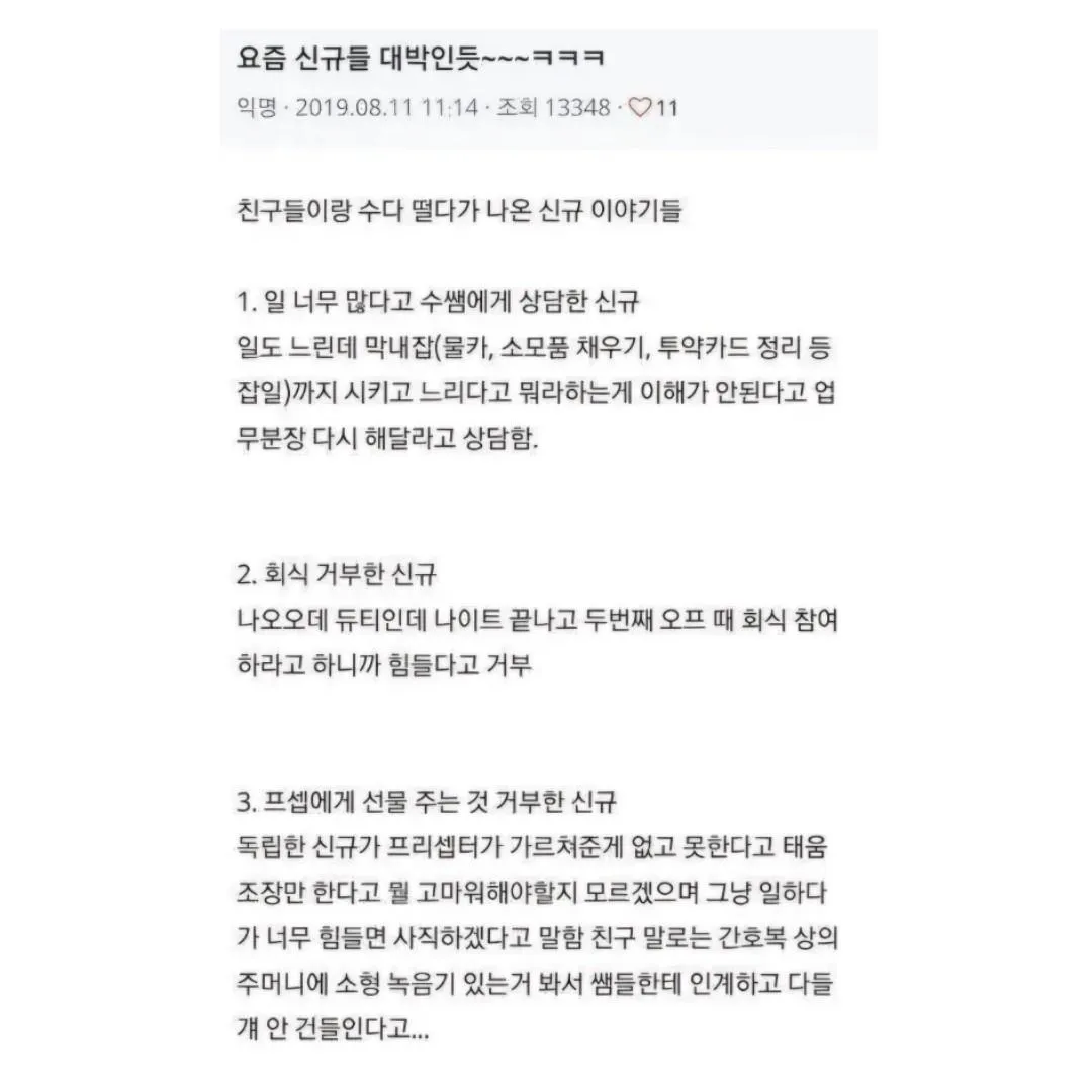 글의 핵심은 업무량과 역할 분장의 불균형이다. 신규가 "일 너무 많다"고 상담하는 상황에서, 막내에게까지 소소한 잡일이 늘어나고 느려 보인다는 이유로 비판받는다는 이야기가 전해진다. 물카, 소모품 채우기, 투약카드 정리 같은 일들이 쌓일 때, 진짜 성장의 여정은 어디로 가는 걸까.