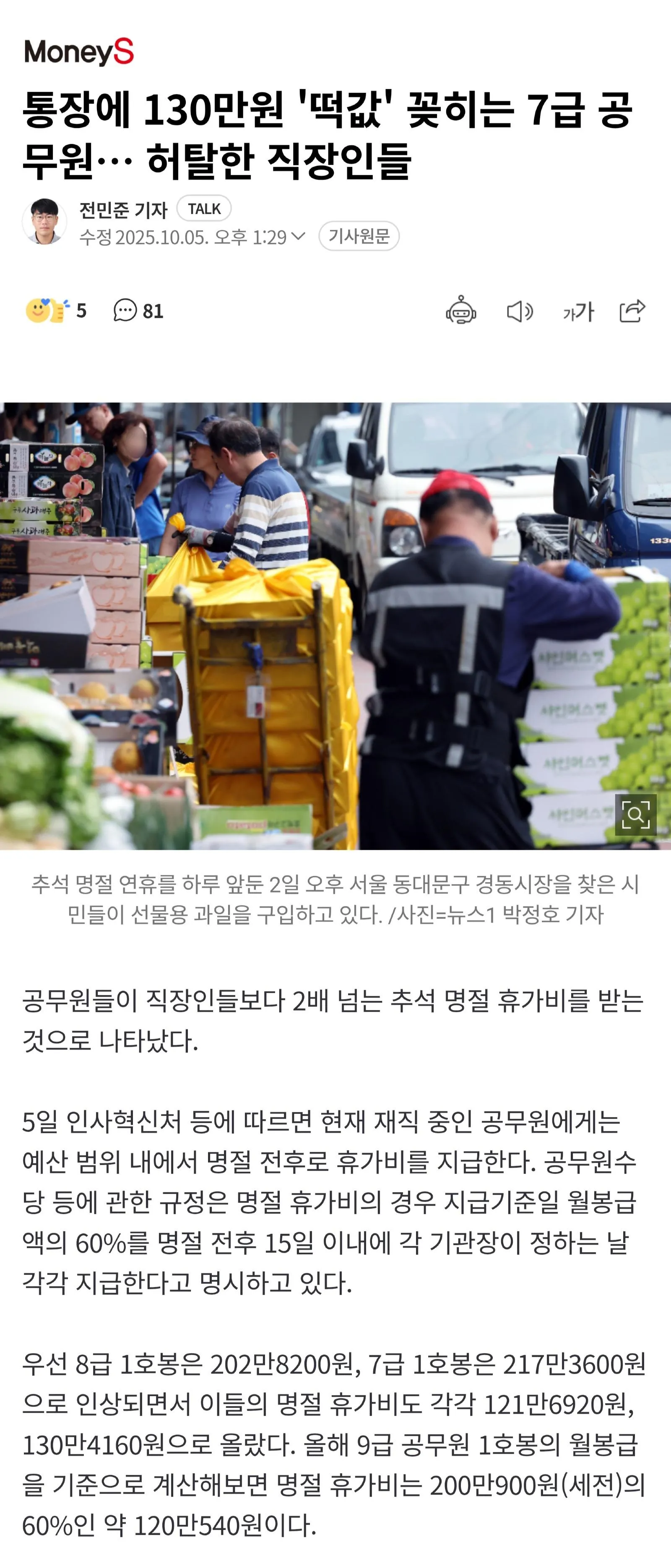 최근 MoneyS의 보도가 전하는 얘기는, 7급 공무원 가운데 일부가 추석 연휴를 앞두고 통장에 130만원가량의 ‘떡값’이 들어오는 사례를 언급한다는 것이다. 또한 보도에 따르면 공무원들이 받는 추석 휴가비가 민간 직장보다 두 배 이상 많게 나타났다고도 한다. 이 같은 소식은 직장에서의 금전 흐름이 공무원과 민간 근로자 사이에서 다르게 작동한다는 사실을 우리 일상에 다시 떠올려 준다.