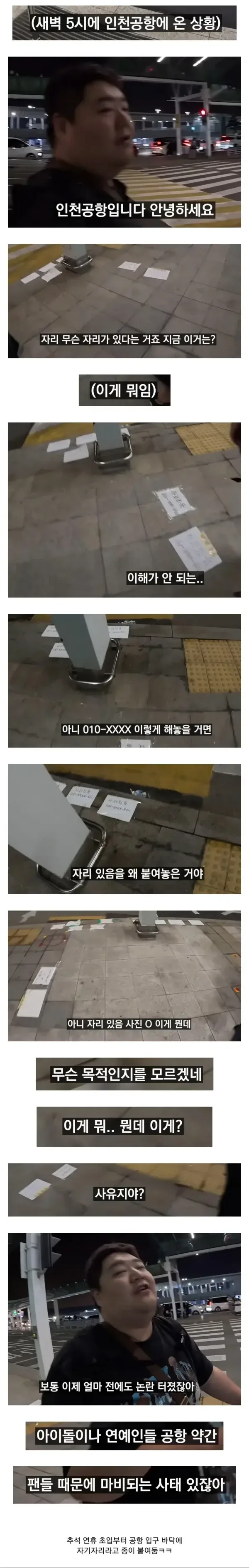 새벽 5시의 인천공항. 어둠이 채 가시지 않은 터미널에서 바닥에 붙은 “자리 있음”이라는 낯선 종이가 눈에 들어온다. 이 현장을 두고 사람들은 서로 다른 추측을 쏟아내며, 의도와 목적이 모호하다고 입을 모은다.