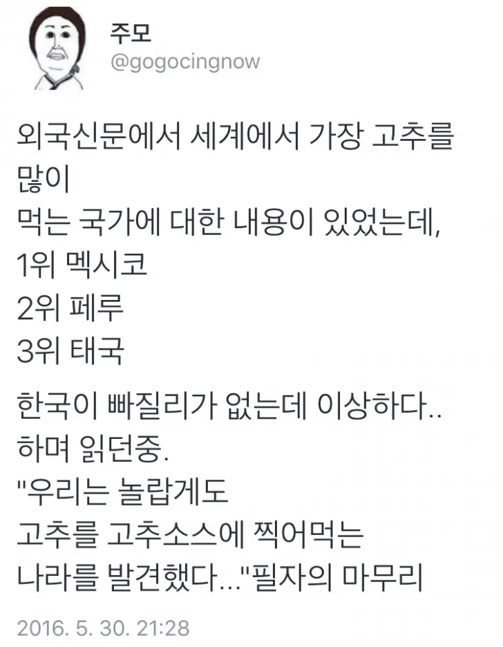 언론은 종종 특정 관점으로 데이터를 포장한다. 멕시코, 페루, 태국이 상위를 차지한다는 식의 프레이밍은 독자의 흥미를 끌지만, 그 뒤에 숨은 가정은 무엇일까 생각하게 한다. 그리고 ‘고추소스에 찍어 먹는 나라’라는 결론은, 소비 방식의 차이가 ranking의 큰 차이를 만든다는 신호일 수 있다.