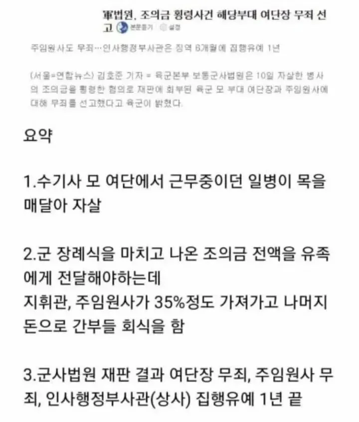 오늘은 자살로 생을 마감한 병사의 조의금 문제가 왜 사회적으로 큰 화두가 되는지, 바쁜 직장인인 우리도 이해하기 쉽게 풀어볼게요. 군대의 법적 판단은 멀게 느껴지지만, 결국은 신뢰와 절차의 문제와 맞닿아 있습니다. 보도 자료에 따르면 자살한 병사의 조의금을 두고 일부 간부가 금액의 일부를 가로챘다는 의혹이 제시되었고, 육군은 이 사건에 대해 무죄를 선고했다고 밝혔죠. 이 판단은