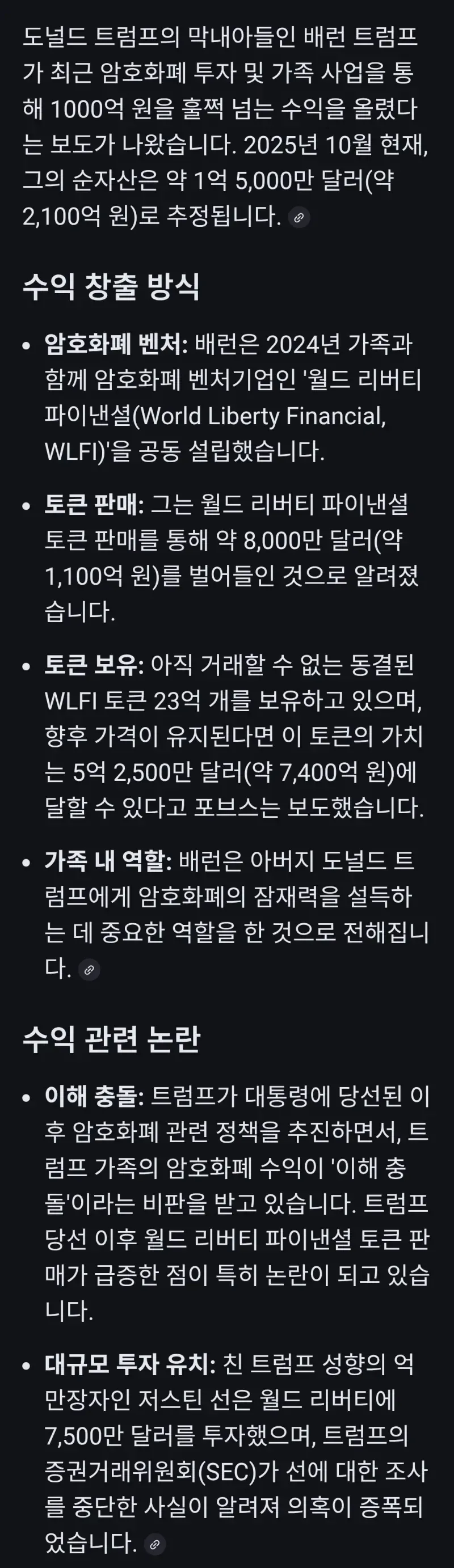 요즘 어디선가 들려오는 가볍고도 냉소적인 분위기의 말들. 정치 뒷이야기라는 이름의 흐름도 함께 떠오른다네. 한 정치가의 가족이 암호화폐 벤처에 손을 댔다는 소문이 퍼지고 있다네. 사람들 사이에선 수익 얘기도 오가지만, 사실 여부는 아직 누구도 확신하지 못해.
