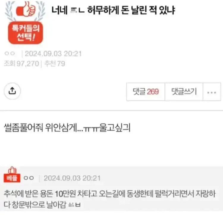 추석 끝나고도 한참이 지나고 나서도, 말 그대로 소문은 낭낭하게 돌아다녔어. 말하자면 어느 톡커가 받은 10만원 이야기가 커다란 바람을 일으켰지. 그날 카페 창가에서 들뜬 목소리로 용돈 자랑을 하던 그 사람이 있었대. 근데 웃긴 게요, 그 말이 커다란 반향을 부르는 바람에 사람들은 하나둘씩 '저건 무슨 수로 그랬지?' 하고 추리하기 시작했지.