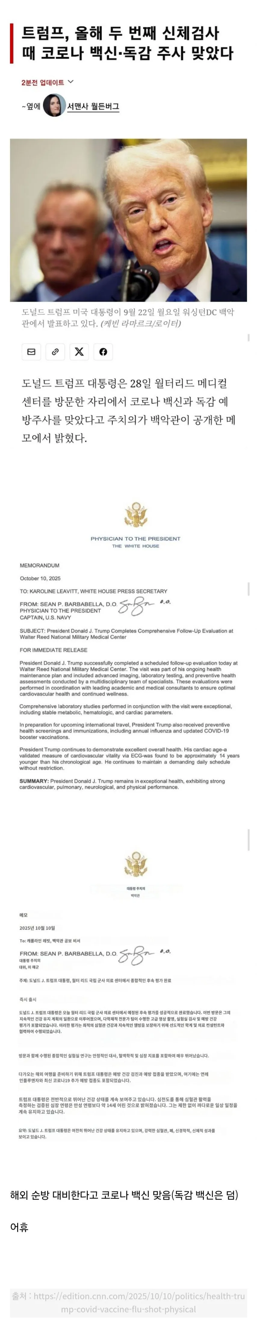 요즘 핫한 뒷이야기 하나, 트럼프가 코로나 백신을 맞았다는 소문이 돌고 있다. 백악관의 공식 발표가 나오기도 전에, 누군가는 이것이 ‘건강 관리 계획’의 일환이라고 말한다. 또 다른 쪽에선 해외 순방 대비의 한 수일 뿐이라고 하지만, 소문은 금방 핫한 이슈로 번진다. 이 글은 그 단서를 따라가며 맥락을 한 번 재구성해본 이야기다.