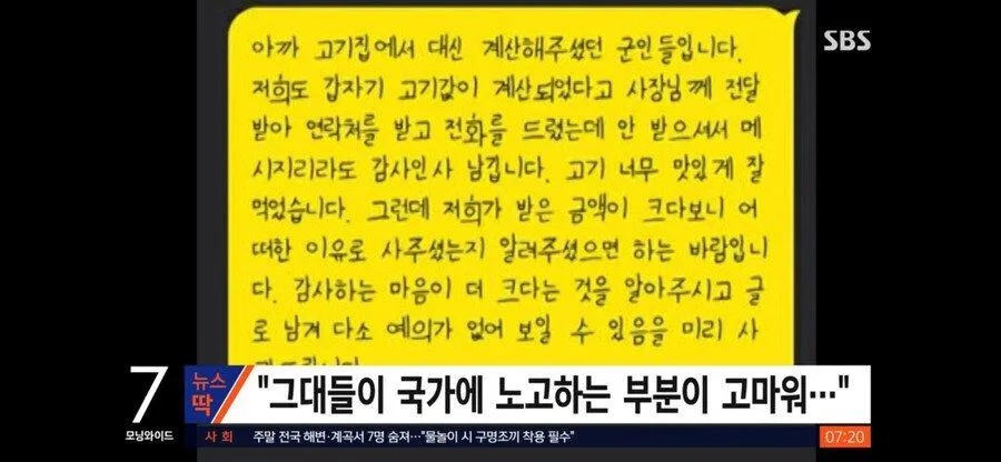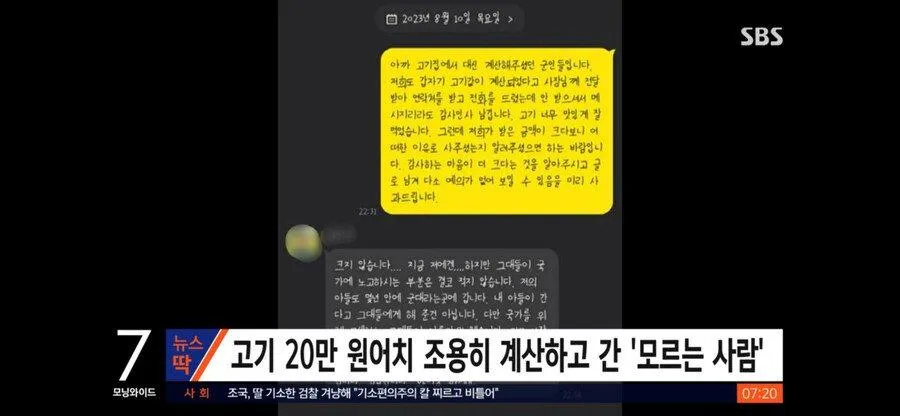 최근 SNS에서 뜨거운 감자처럼 떠도는 소문 하나, 바로 '20만원 결제' 이야기예요. 고기 20만 원어치를 구워 먹고 있던 군인들이 한참 즐겁게 식사를 하던 사이, 한 중년 남성이 스윽 보더니 고기값을 지불하고 조용히 자리를 떠났대요. 당연히 연락이 안 돼서 사장님께 소식을 전하려 하니, 그는 대신 감사 인사를 남겼다고 해요. 이 작은 사건이 우리 사회의 어떤 면을 비춘 걸까요? 아직은 단정하기 어렵습니다.