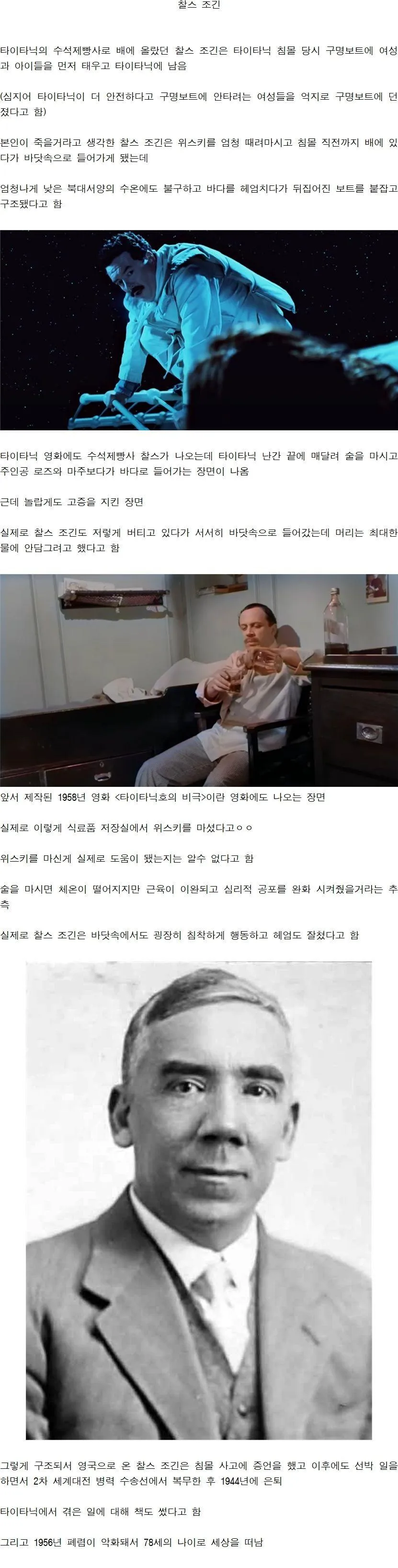 영화 속의 장면처럼, 바다의 냉기가 한밤중을 지나며 그의 머리칼과 구두끈에까지 신비한 긴장을 남겼을 거예요. 영화 '타이타닉'에서도 로즈와 맞닥뜨리던 구간처럼, 조긴은 위스키를 마시며 몸을 보존하려 애쓴 것 같다는 해석도 있고, 심리적 안정을 위해 한동안 앉아 있었던 것이라는 해석도 있죠. 물론 위스키가 체온을 올려주진 않는다더라도, 그가 겪은 극도의 공포를 완화하는 데는 나름의 역할을 했을 거라는 추측은 남아 있어요. 이 모든 게 과연 어느 정도의 사실에 가깝고, 어느 정도의 극화일지는 여전히 의심스럽습니다.