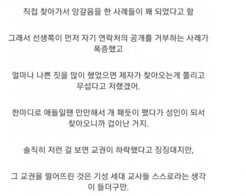 현재 상황은 더 복잡하다. 제자들이 과거의 체벌이나 부조리를 털어놓고 전화나 직접 만나 묻는 사례가 늘어나고 있다. 그로 인해 교원들이 정보 제공 거부를 선택하는 경향이 뚜렷해졌다는 말도 나온다. 일부는 ‘세대 간 갈등의 표출’이라고 보고, 다른 일부는 교실의 권력관계가 바뀌었다는 신호라고 본다. 여러 해석이 교차하는 가운데, 이 흐름이 정말 교실의 분위기를 바꿀 수 있을지 모두의 관심사다.