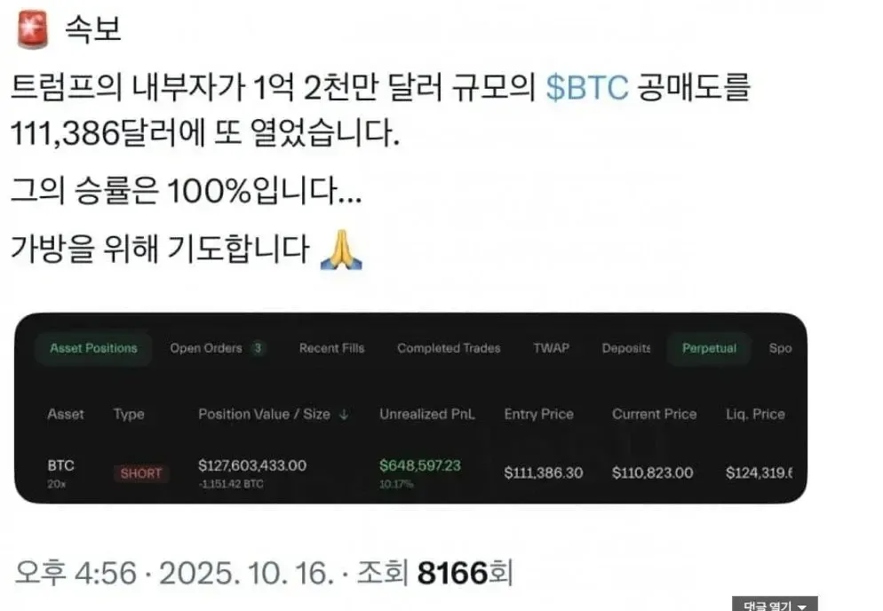 암호화폐 공매도, 오늘의 핫 이슈가 된 이유는 단순한 숫자 놀음이 아닙니다. 트럼프의 내부자 계좌라는 소문이 화면 속 차트를 움켜쥐고 있으니까 말이죠. 그가 열었다는 포지션은 약 1억 2천만 달러 규모의 숏으로 보이며, BTC를 111,386달러에 신규 진입했다고 한다. 레버리지는 20배, 포지션은 SHORT, 현재 가치는 약 1억 2천만 달러선이지만 손익은 바닥에서 흔들린다. Entry Price 111,386.30, Current Price 110,823.00, Liq Price 124,319. 이 정도 수치가 나오면 누가 봐도 심리전의 일부처럼 보인다.