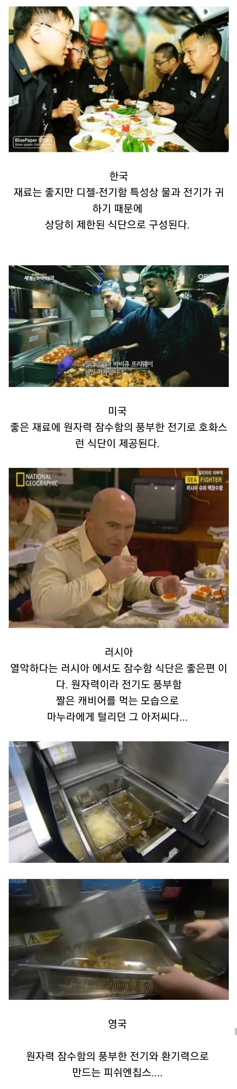 반면 미국의 원자력 잠수함은 전력의 여유가 남다 보니 식단에 여유가 생긴다고 한다. '풍부한 전기로 호화로운 식단'이 당연히 가능하다고 입에 담는 칼럼들도 있다. 러시아의 강국 이미지를 생각하면, 열악한 국력 속에서도 식단이 괜찮았다는 보도도 흘러나온다. 영국 쪽은 원자력 잠수함의 환기와 전기로 피쉬앤칩스를 만든다는 소문이 나오는데, 이건 과연 사실일까, 아니면 냄새나는 해석일까?