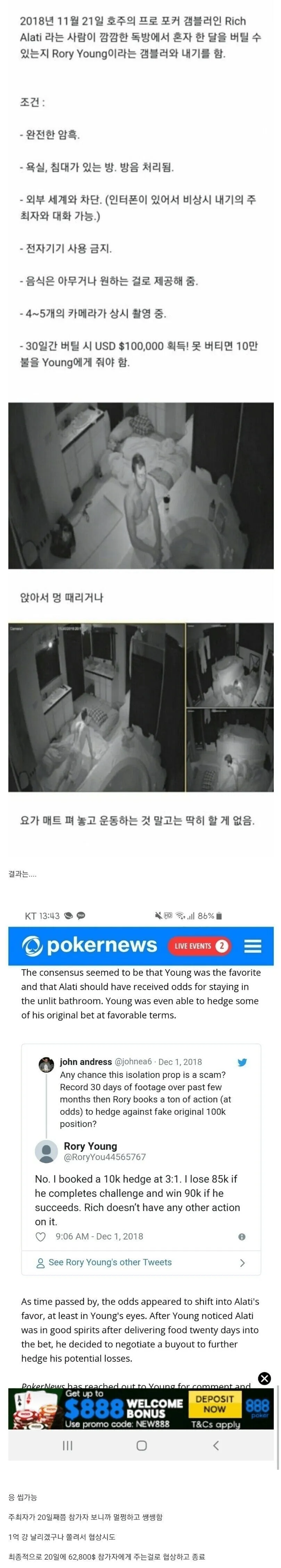 독방 도전에 대한 이야기가 다시 불붙었다. 소문에 따르면 포커 갬블러 Rich Alati가 Rory Young과 30일 버티기 내기를 벌였다고 한다. 완전 암흑의 방에는 침대와 욕실이 있고, 방음은 물론 외부와 차단된 채 4~5대의 카메라가 상시 촬영했다. 전자기기는 금지되지만 음식을 원하는 만큼 받고, 30일을 버티면 USD 100,000의 현금이 걸려 있었다.