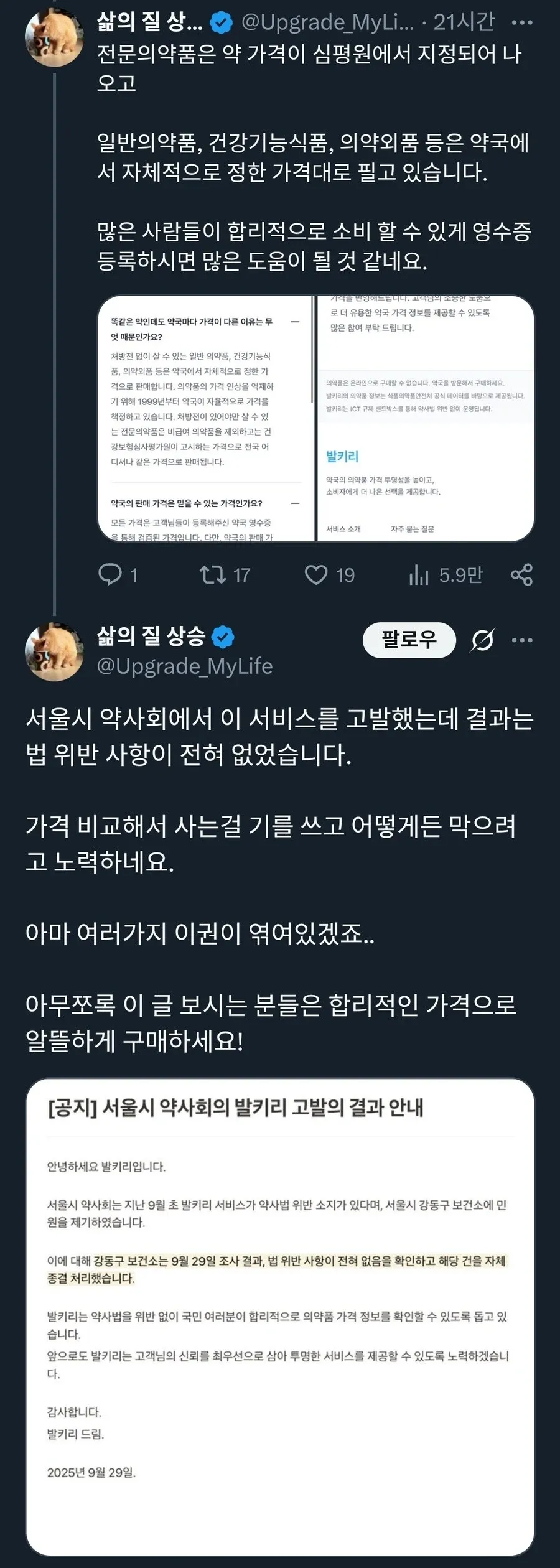 호기심 많은 우리 동네 커뮤니티가 또다시 핫 이슈에 불이 붙었네요. 이번 주의 주인공은 약 가격 비교 서비스 '발키리'예요. 서울시 약사회가 발키리를 약사법 위반 소지가 있다며 강동구 보건소에 민원을 제기했다는 소식이 돌더니, 이 이슈는 순식간에 여러 카페와 밈으로 확산됐죠. 그러나 9월 29일 보건소의 조사 결과가 나오자, 법 위반 없음으로 자체 종결되었다는 발표가 들려오고 있습니다.
