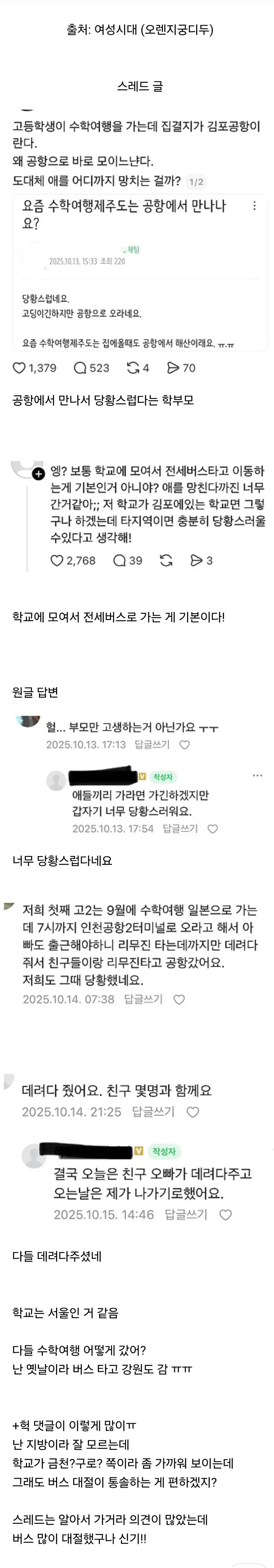 수학여행 학교가 공항까지 데려다 줘야한다 vs 걍 공항에서 만나
