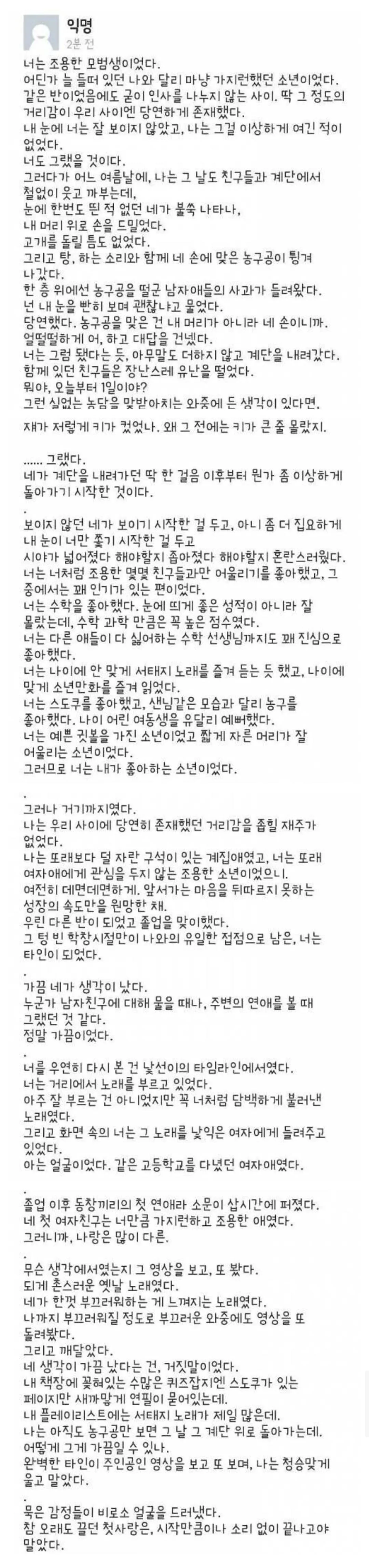 졸업 후 우연히 타임라인에서 너를 다시 보게 될 줄은 몰랐죠. 거기선 네가 아주 담담하게 노래를 부르고 있었고, 화면 속 너는 낯익은 여자에게 작은 이야기를 전하더군요. 그 영상은 우리 사이의 연애사가 아니라, 지나간 시간의 한 조각일 뿐이라는 생각이 들었고, 나는 왜 이리도 오래의 기억이 살아 움직이는지 묻고 말았어요. 혹시 그때의 나는 네가 아닌가?