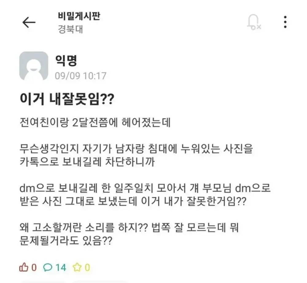 프라이버시 침해가 이렇게 핫한 이슈가 될 줄 몰랐죠. 경북대의 익명 게시판에 올라온 한 글이 그 시작점인데요, 두 달 전 헤어진 여자친구가 남자와 함께 누워 있는 사진을 카톡으로 보냈다며 이야기를 시작합니다. 차단하자 또 DM으로 보내고, 한 주일치 모아 부모님 DM로 보냈다? 이 사건은 왜, 그리고 어떻게 이렇게 굴러가게 되었는지 궁금증이 폭발합니다.