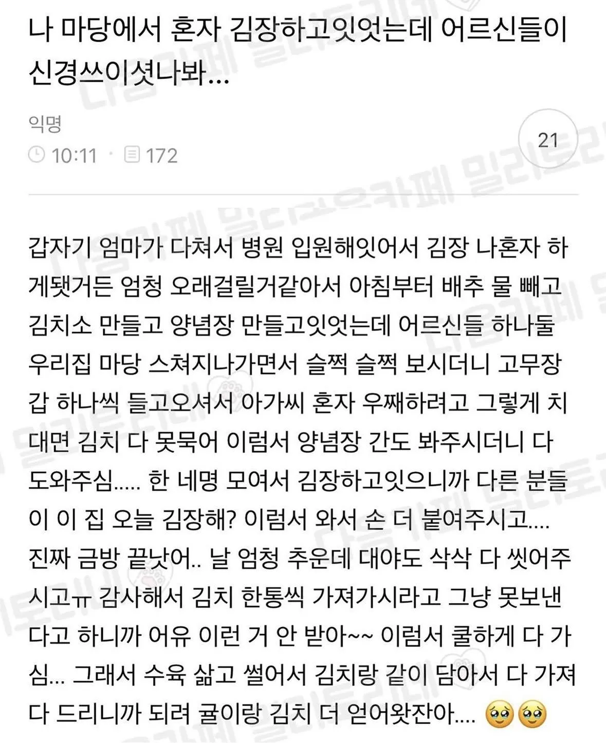핵심 키워드: 김장 도와주기, 공동체 의식. 오늘은 마당이 갑자기 작은 무대가 된 느낌이다. 엄마가 갑자기 다쳐 입원 중이라, 나 혼자 김장을 해야 하는 상황이었거든. 아침부터 배추를 절이고 양념장을 만들며 버티려 애썼지만, 이웃들의 시선은 어느새 따뜻한 관심으로 바뀌었다.