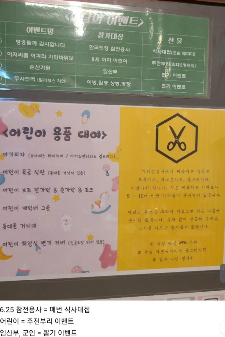 배경이 궁금해진 나는 주변에 돌아다니는 말들을 모아봤다. 벽에 붙은 안내문엔 아기의자, 어린이 목공 식판, 보조 젓가락 같은 아이템 대여가 가능하다고 적혀 있고, 이벤트명은 'CTC OTHE'라고 남아 있대. 또 6.25 참전용사나 임산부, 군인 같은 대상에게 뽑기 이벤트를 연다니, 이게 과연 가족 이벤트의 신호인지 생각이 많아져. 어쩌면 이 모든 게 아이들을 포섭하려는 한 편의 큰 퍼포먼스일지도 몰라.