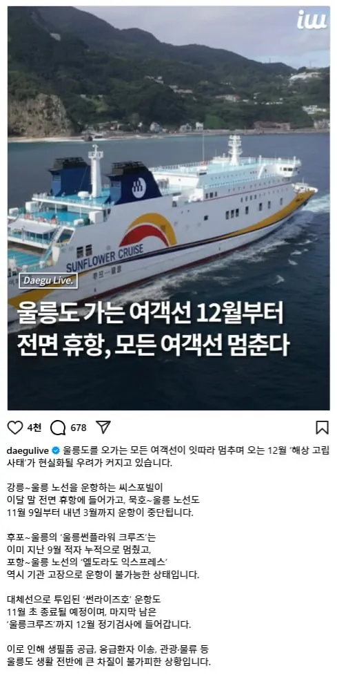 배경부터 살펴볼게요. 강릉-울릉 노선을 운항하는 씨스포빌은 이달 말 전면 운항 휴항에 들어가고, 묵호-울릉 노선은 11월 9일부터 내년 3월까지 운항이 중단됩니다. 울릉썬플라워 크루즈는 지난 9월 적자 누적으로 이미 멈췄고, 포항-울릉 노선의 엘도라도 익스프레스 역시 운항이 불가능한 상태라고 합니다. 대체선으로 투입된 썬라이즈호도 11월 초에 운항이 종료될 예정이고, 남은 울릉크루즈도 12월 정기검사에 들어가요. 이로 인해 생필품 공급 차질이 현실화될 수 있다는 말도 흘러나오고, 관광·물류의 흐름이 한꺼번에 굴곡을 맞을 분위기입니다.