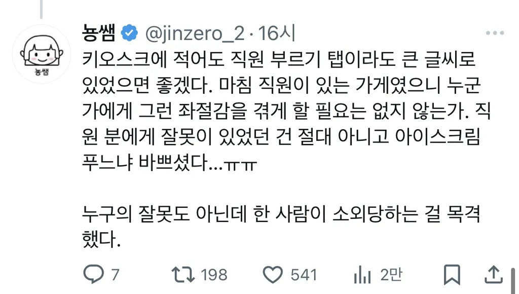 키오스크가 우리 동네의 카페에서도 흔해진 요즘, 어제 아이스크림 가게 앞에서 벌어진 작은 풍경이 아직도 내 머릿속에 남아 있다.