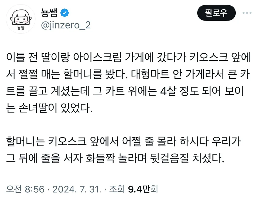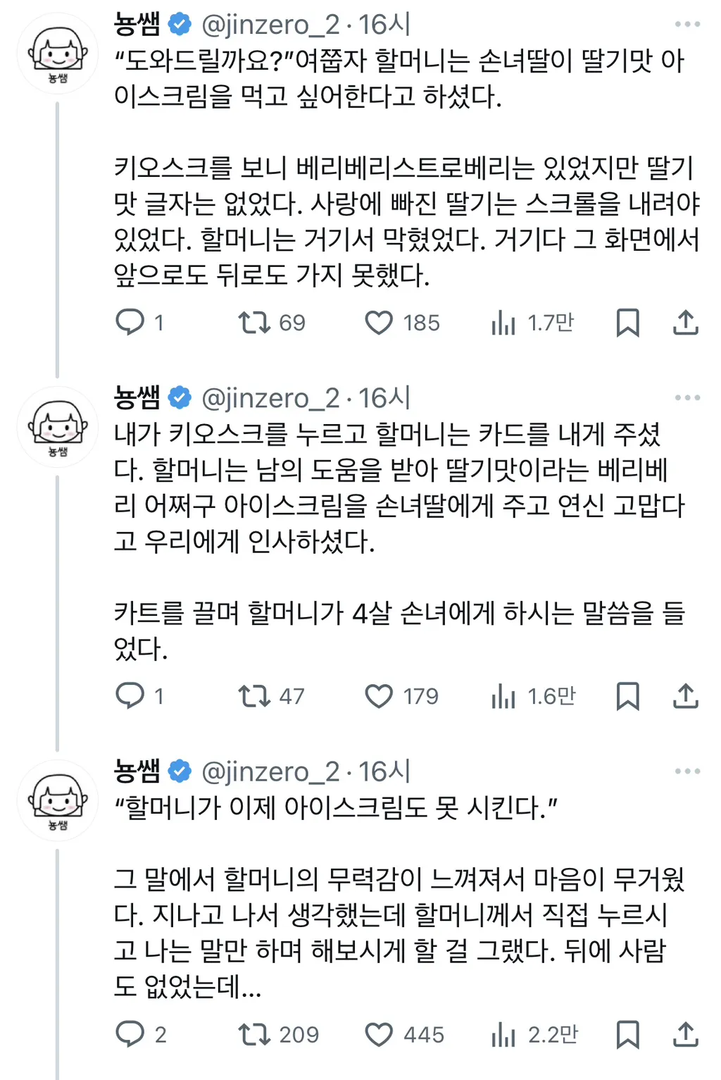 아이스크림 가게 키오스크 앞에서 쩔쩔매는 할머니를 봤다.