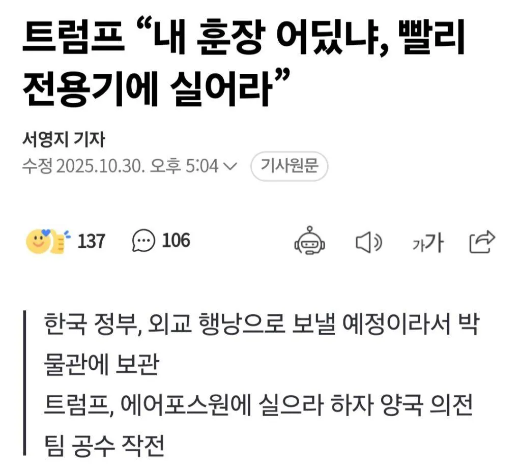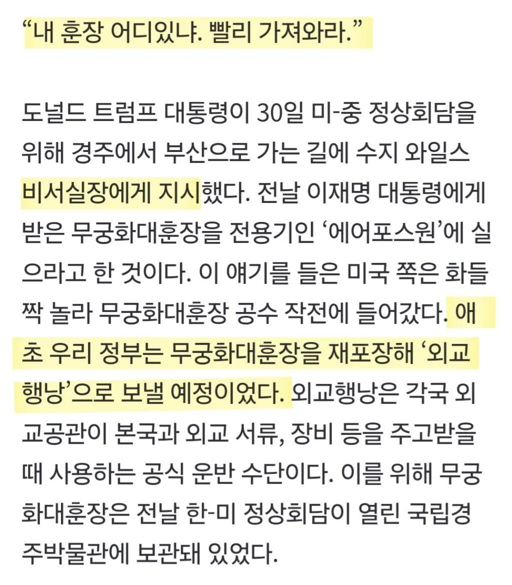 요즘 핫 이슈는 다름아닌 무궁화 훈장과 에어포스원의 만남이다. 미-중 정상회담을 앞두고, 이 훈장을 전용기에 실어 보내려는 소문이 빙빙 돈다. 수지 와일스 비서실장이 지시를 내렸다는 말도 돌고 있지만, 그 배경엔 외교행낭으로의 운반이라는 낭만적 발상도 어른거린다. 그래도 이야기의 실타래를 따라가보면, 상징물이 살아 움직이는 외교의 작은 축제가 벌어지는 느낌이다.