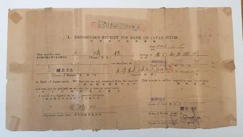 2. 그동안 모은돈 일본돈 약 1만2천220엔은 거액이라 집에 보관하지 않고 1946년 조흥은행 예천군 지점에 맡긴 후 현금 보관증을 받음.
