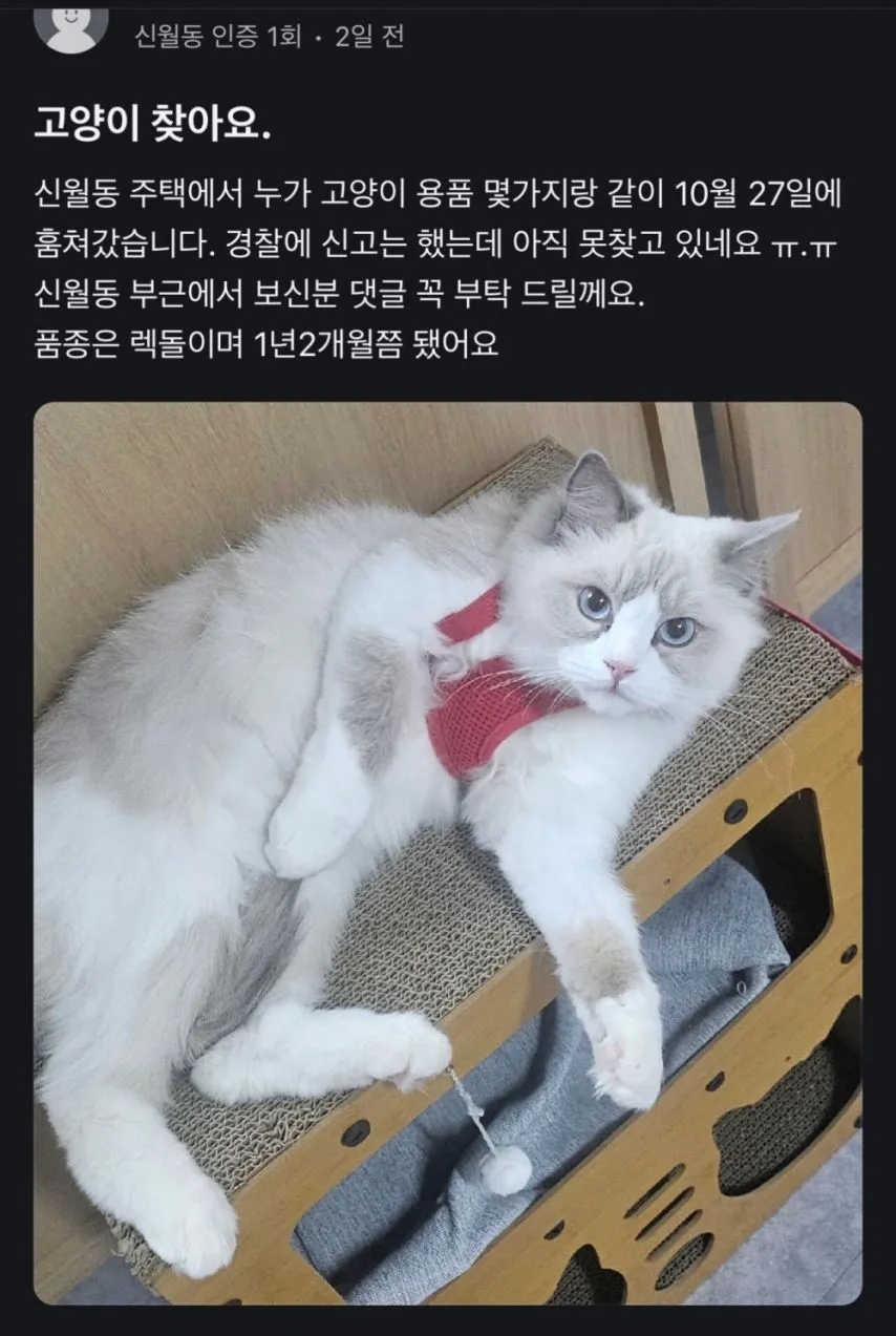 요즘 신월동에서 터져 나온 핫한 소식 하나, 바로 '고양이 도난' 이야기다. 집집마다 창가에 털복숭이 눈망울이 스치면 누가 마음이 흔들리니까. 10월 27일에 고양이와 몇 가지 용품이 함께 사라졌다고 한다. 품종은 렉돌이고 나이는 대략 1년 2개월쯤으로 들려오는데, 이건 한 편의 사연 같은 느낌이다.