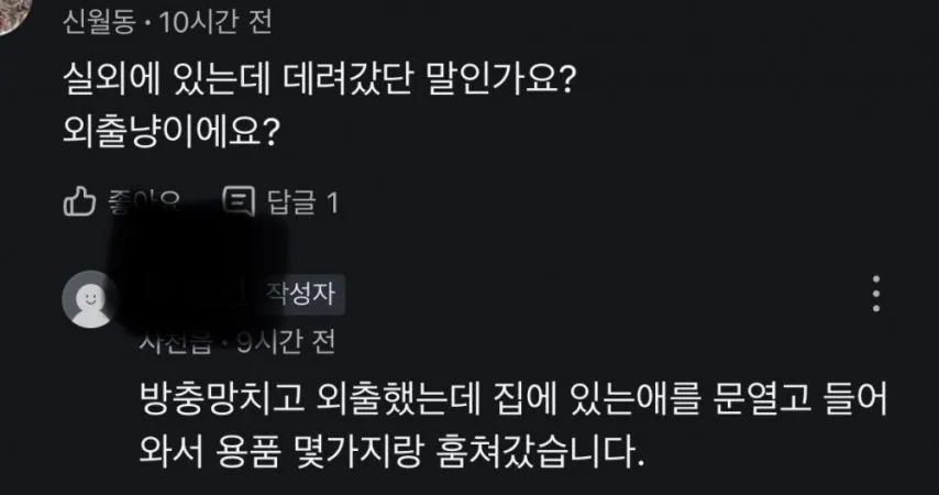 방충망을 닫고 외출했는데, 돌아오니 문이 열려 있고 집 안의 물건이 흩어져 있었다. '방충망 치고 외출했는데...' 이건 댓글의 요지, 마치 누군가가 집의 리듬을 읽고 따라온 듯하다. 실종된 고양이는 아직 밖으로 벗어나지 못했다고 해도, 용품들만 남겨둔 채 사라진 건 뭔가 배려심이 부족한 범죄의 냄새가 난다.